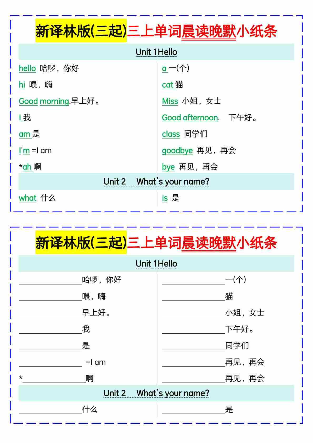 新译林版(三起)三上单词晨读晚默小纸条