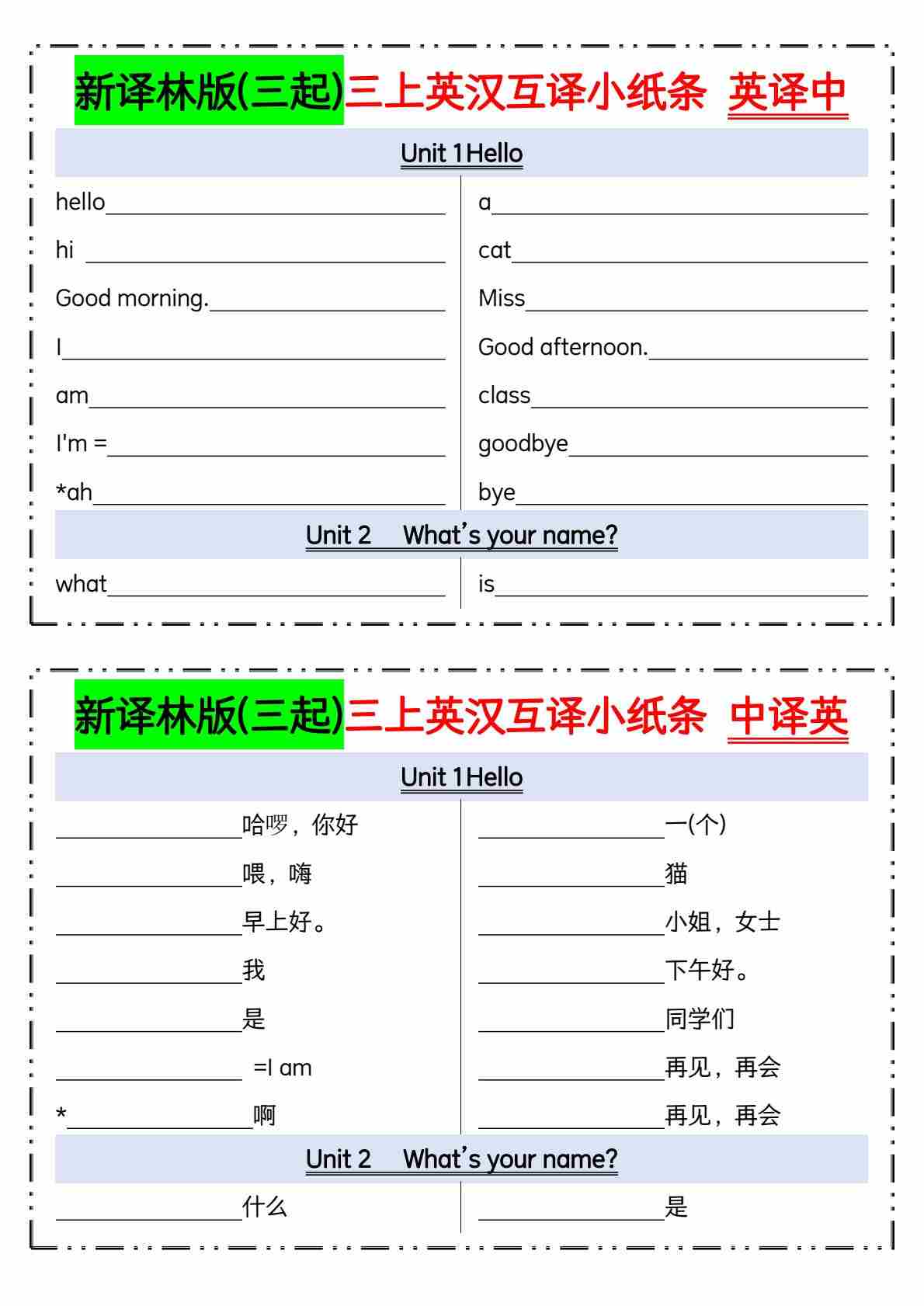 新译林版(三起)三上英汉互译小纸条