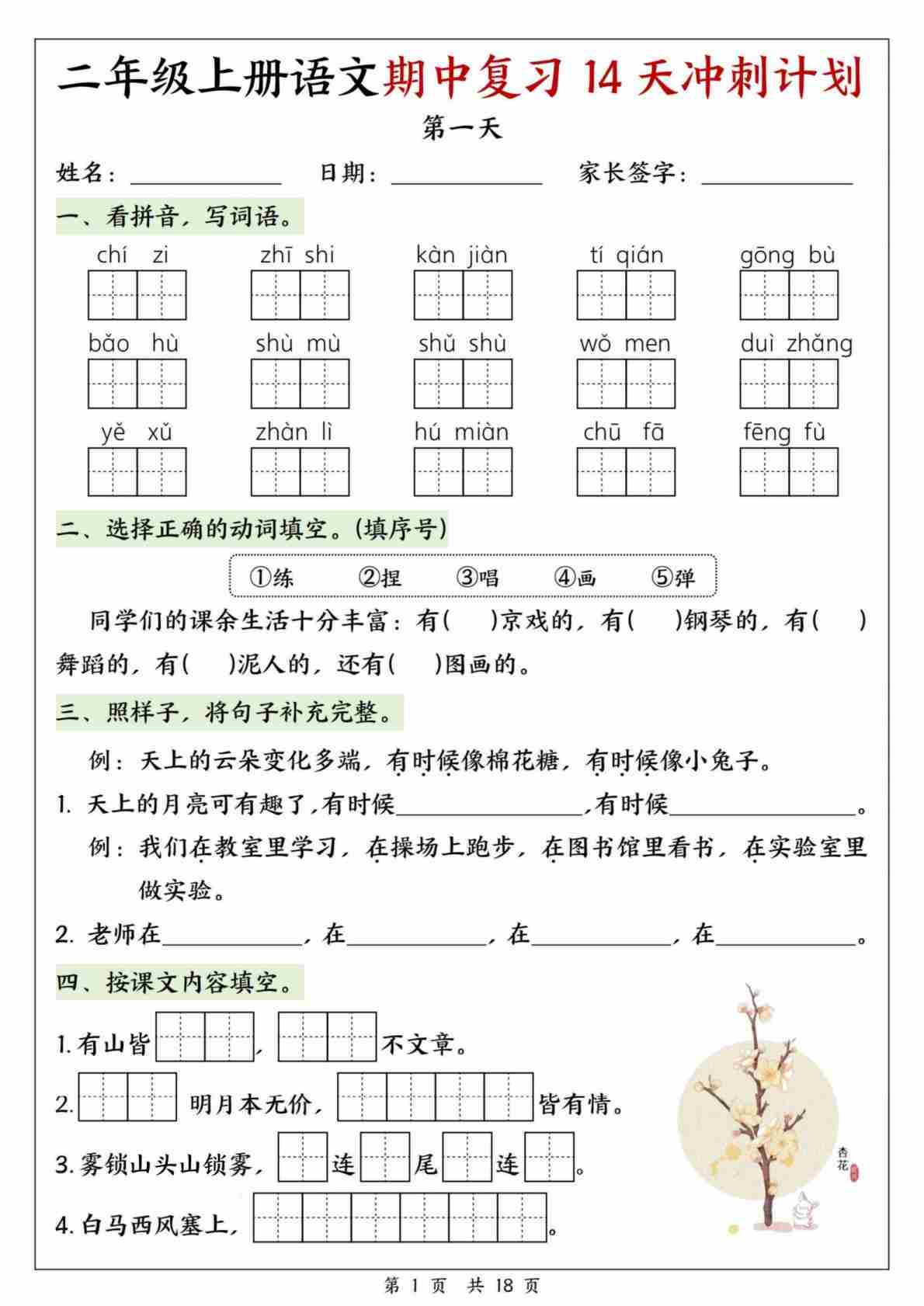 二(上)语文25年新版期中复习14天冲刺计划
