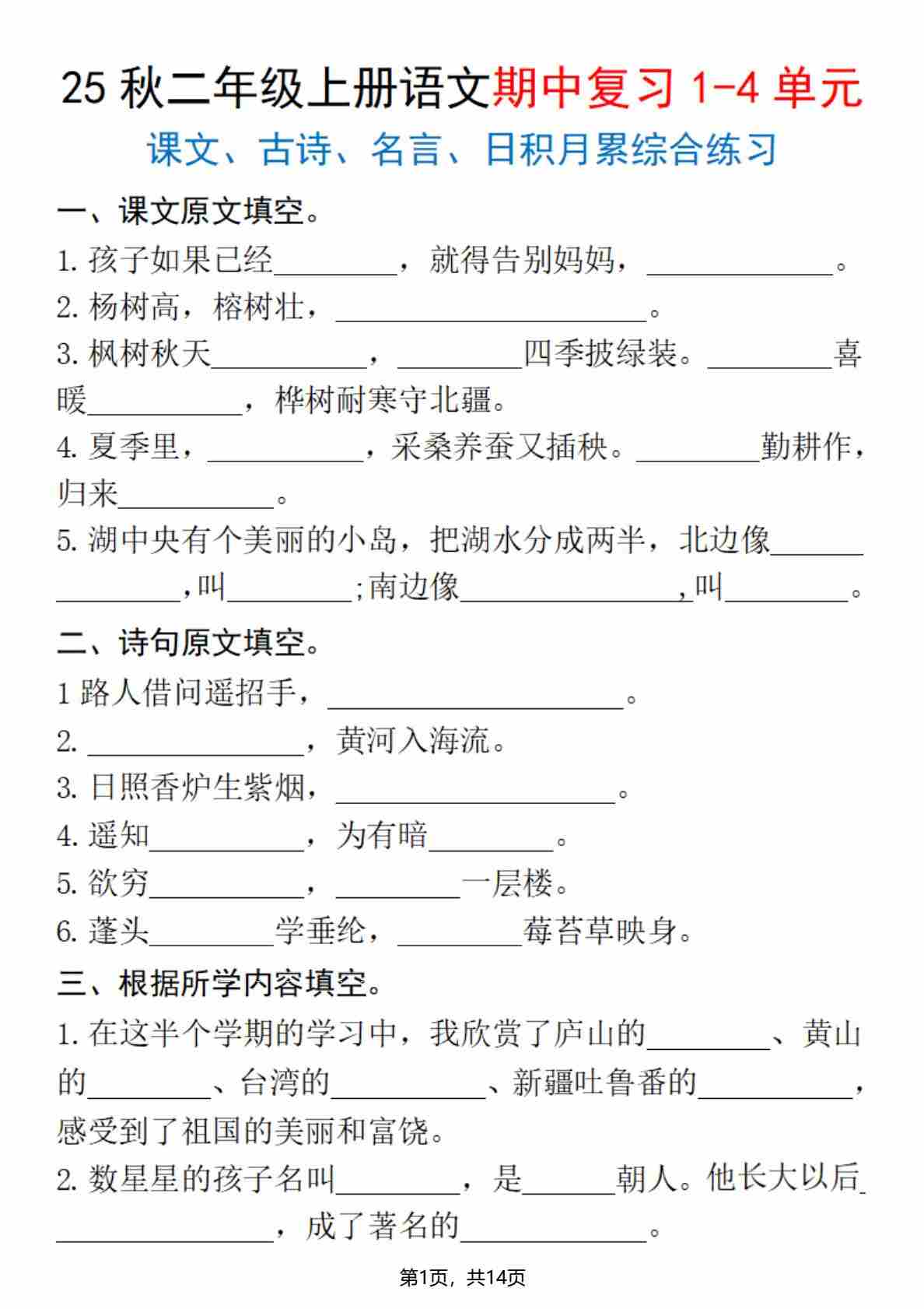 二(上)语文【25秋期中复习1-4单元(课文古诗名言日积月累综合练习)含答案14页