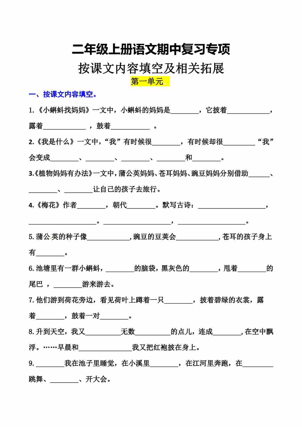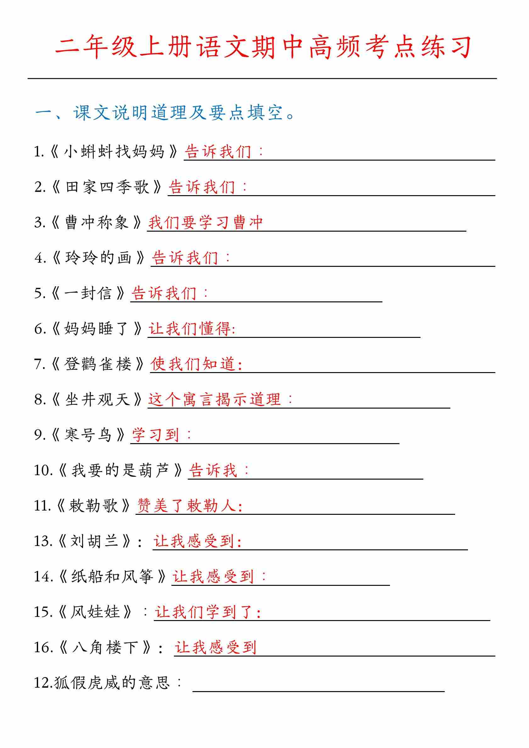 二(上)语文【期中专项二】课文内容填空及相关拓展