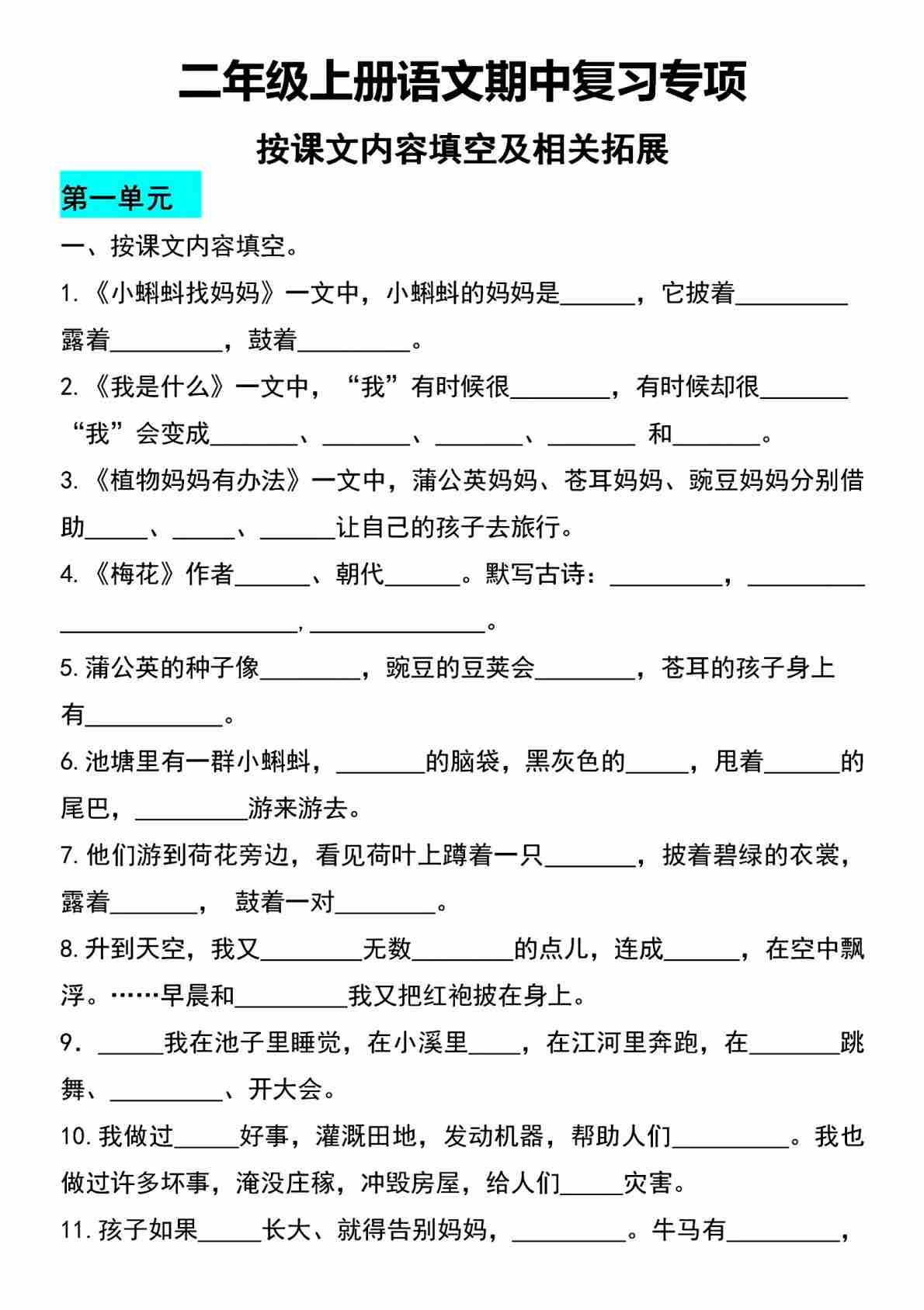 二(上)语文期中复习按课文内容填空及相关拓展