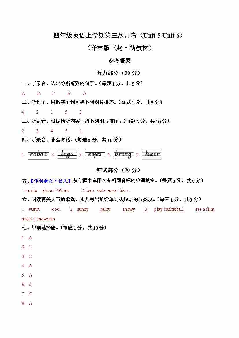 四上译林第三次月考(Unit 5-Unit 6)(参考答案)