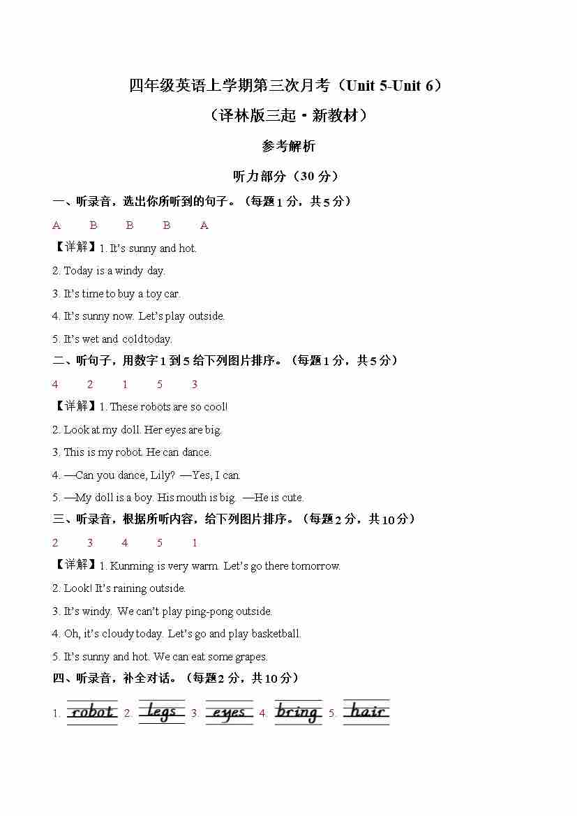 四上译林第三次月考(Unit 5-Unit 6)(参考解析)