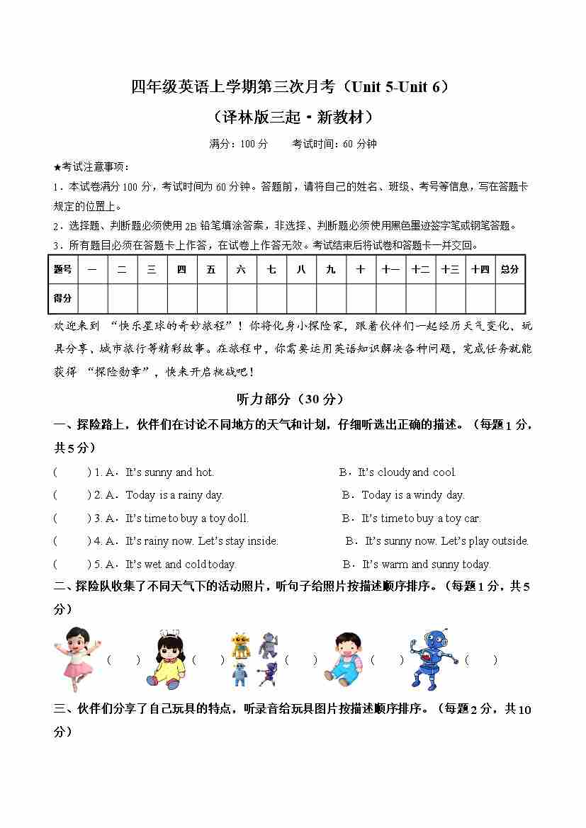 四上译林第三次月考(Unit 5-Unit 6)(考试版A4)大情境试卷