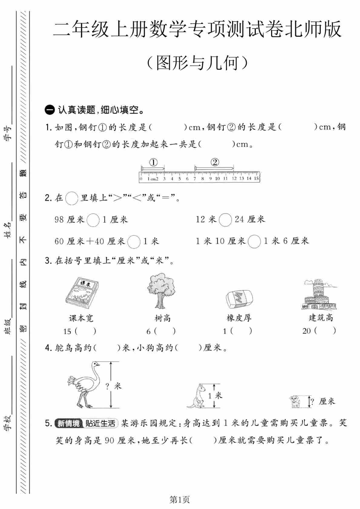 二年级(上)数学 图形与几何专项测试卷《北师版》