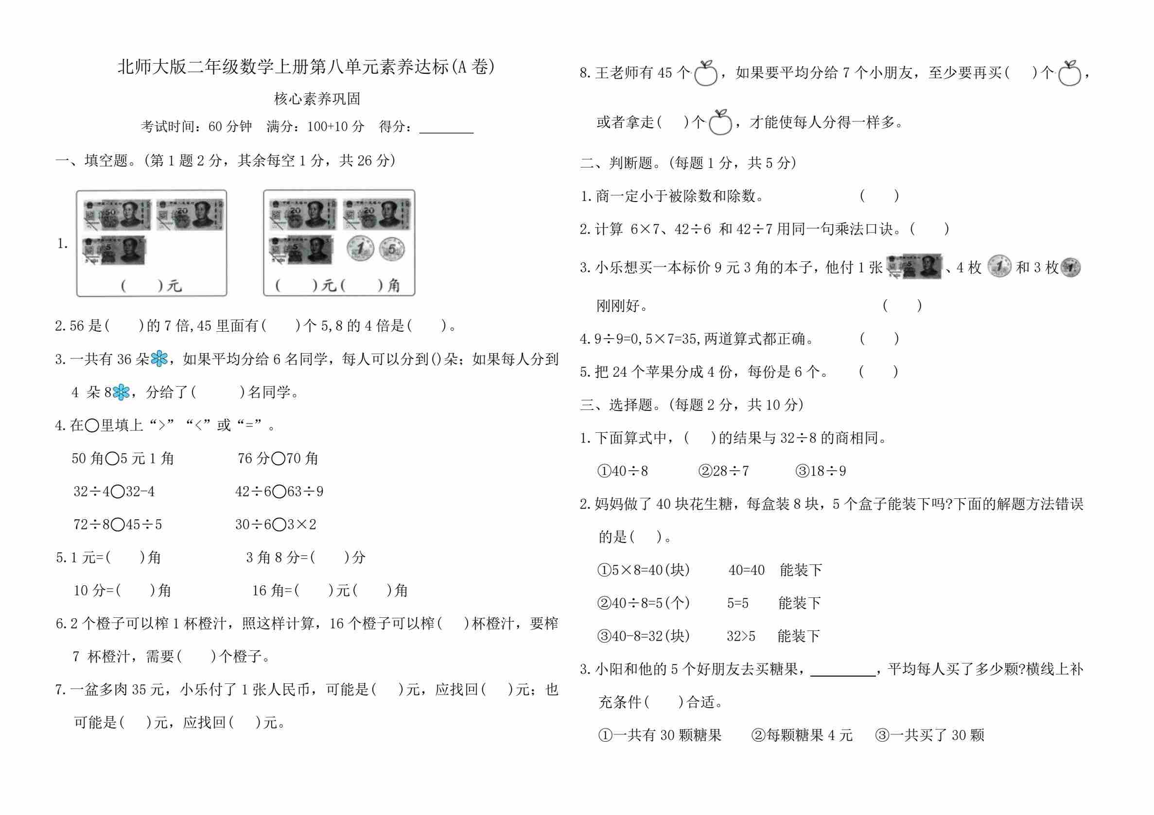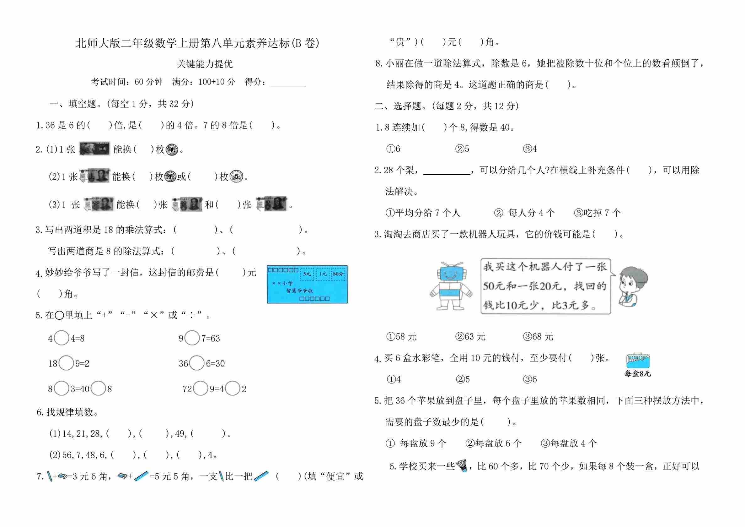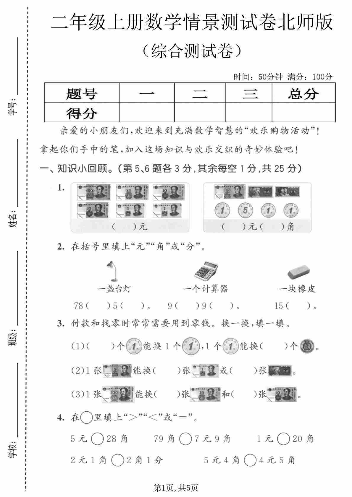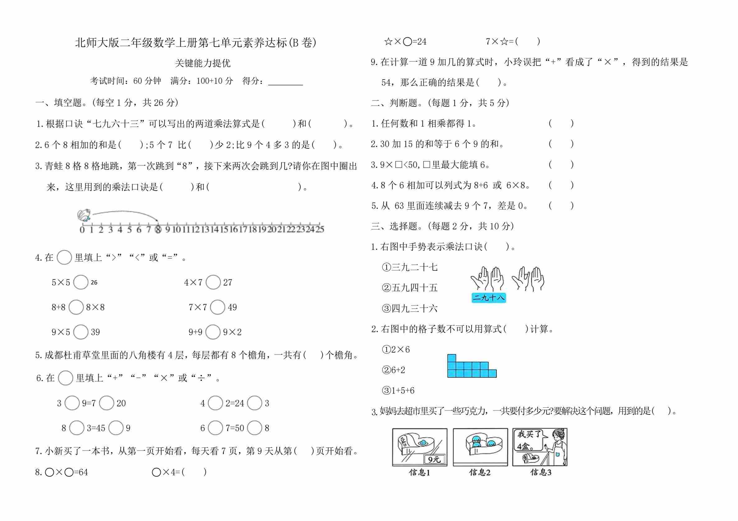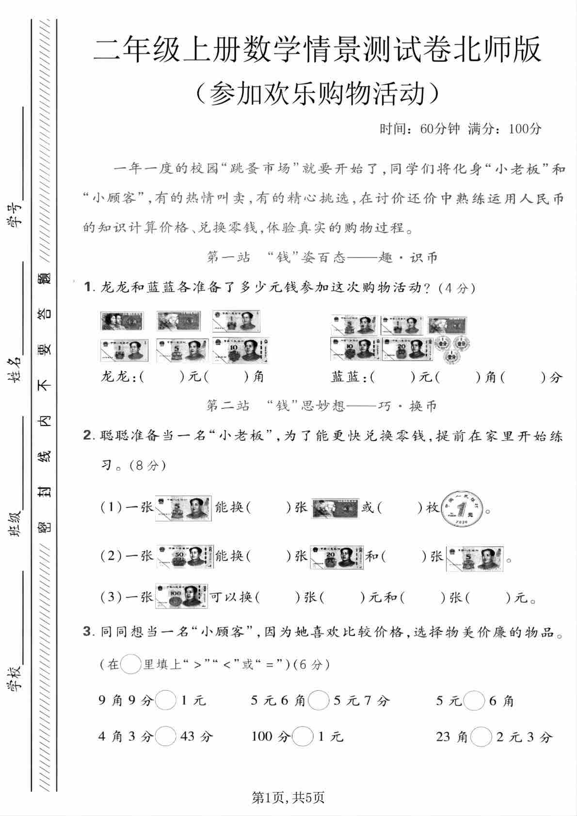 二年级(上)数学 情景测试卷(参加欢乐购物活动)《北师版》
