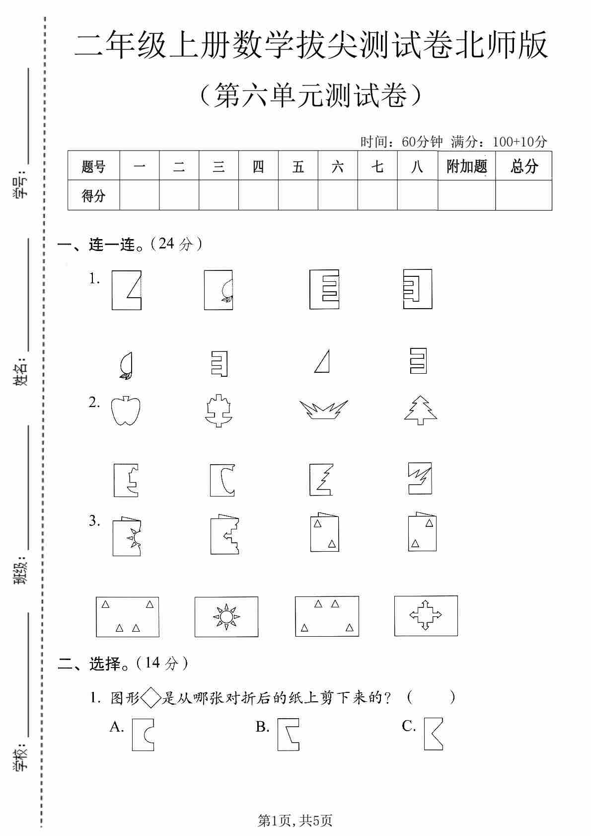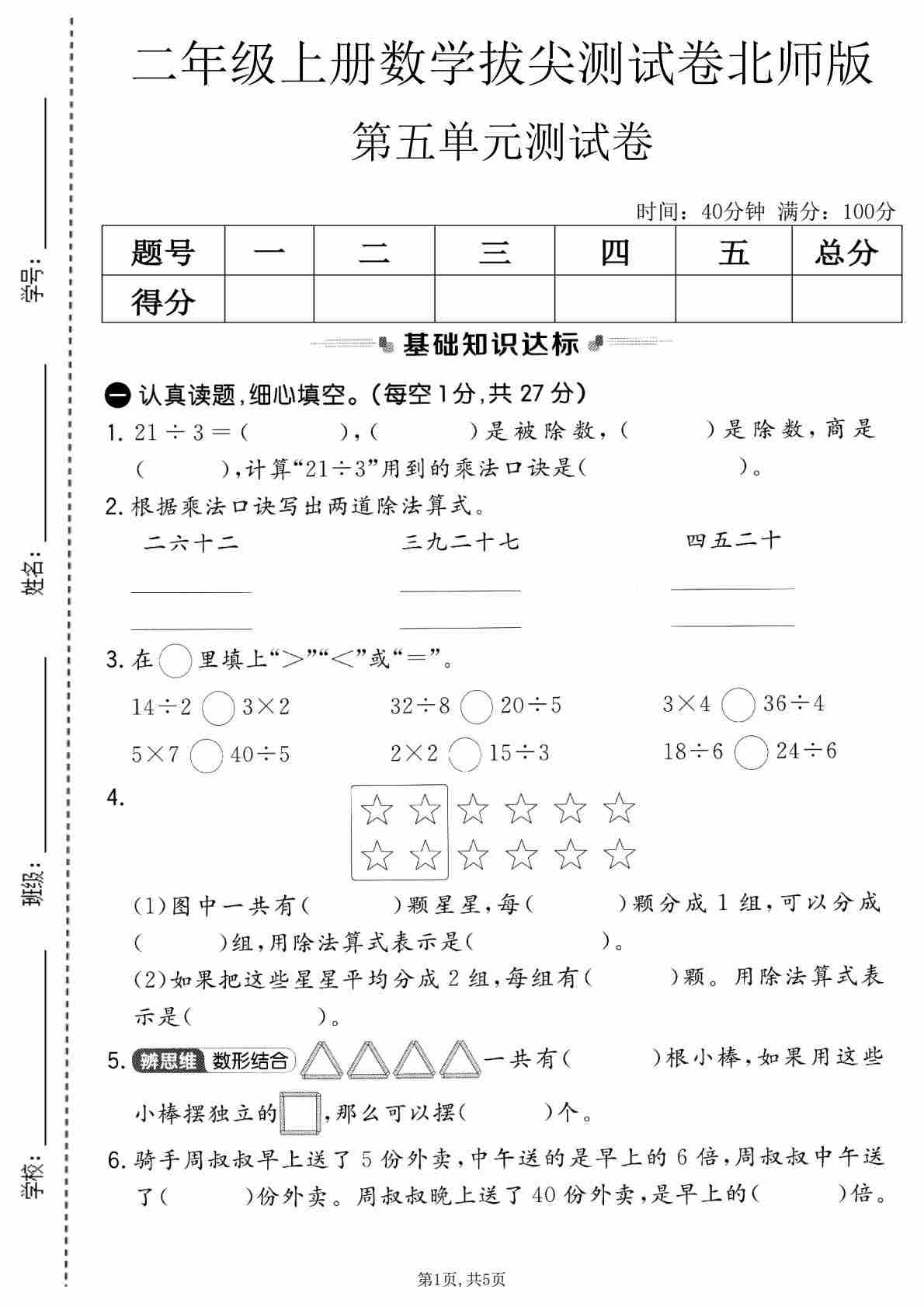 二年级(上)数学 第五单元拔尖测试卷《北师版》(1)