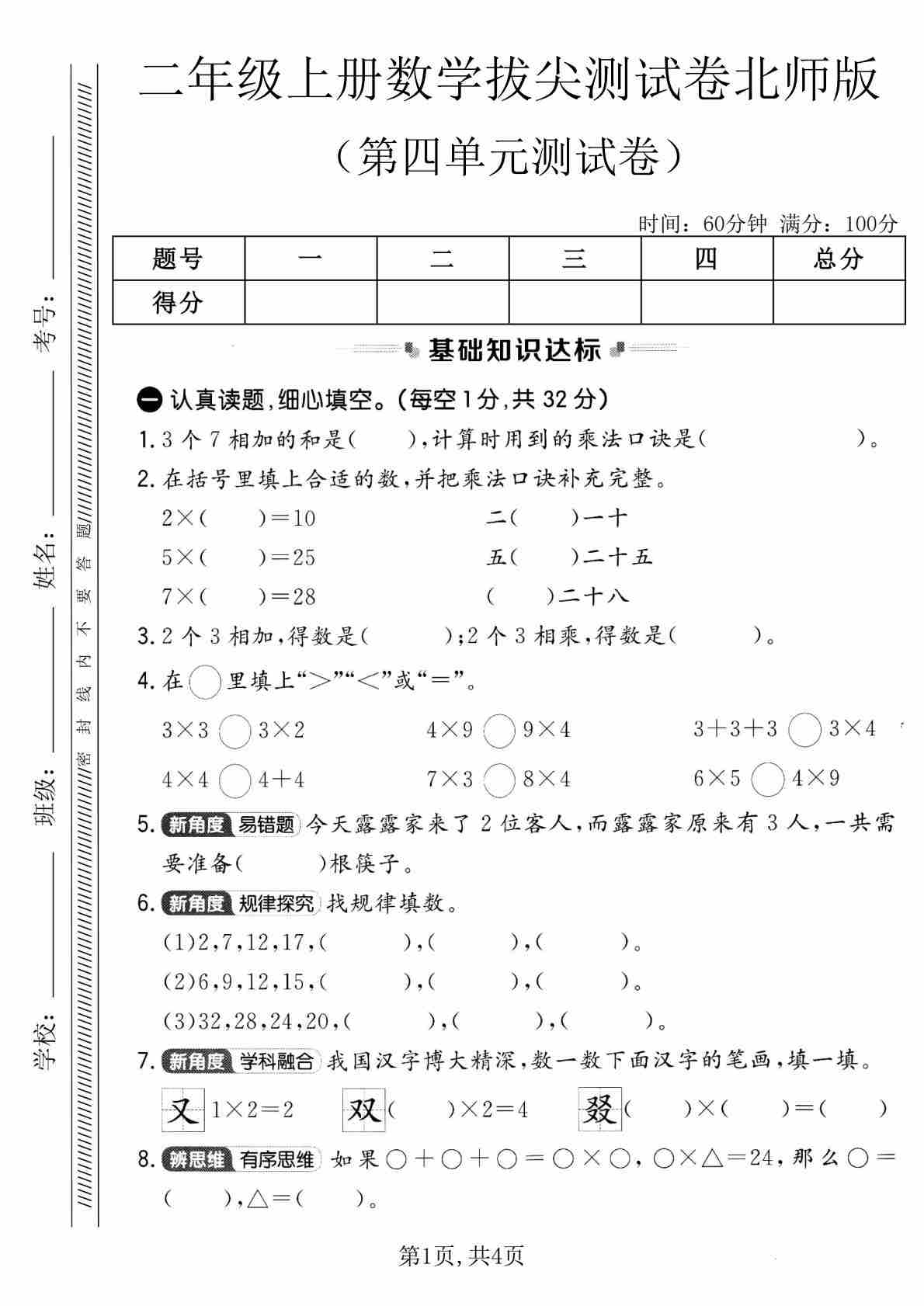 二年级(上)数学 第四单元拔尖测试卷 《北师版》