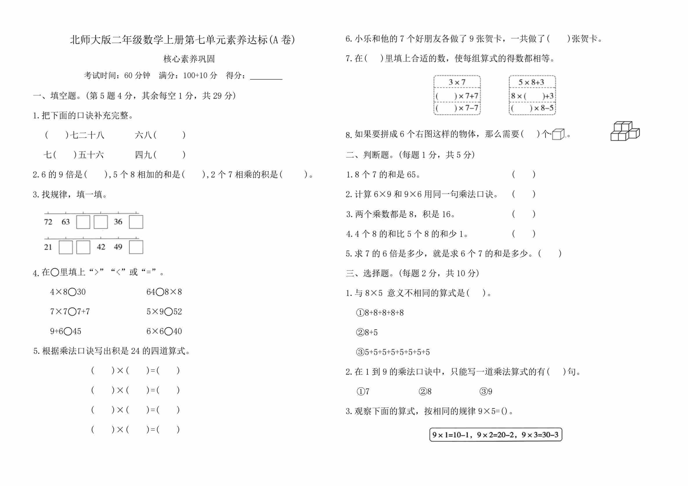第七单元 乘法口诀(二)素养达标(A卷)(含答案)