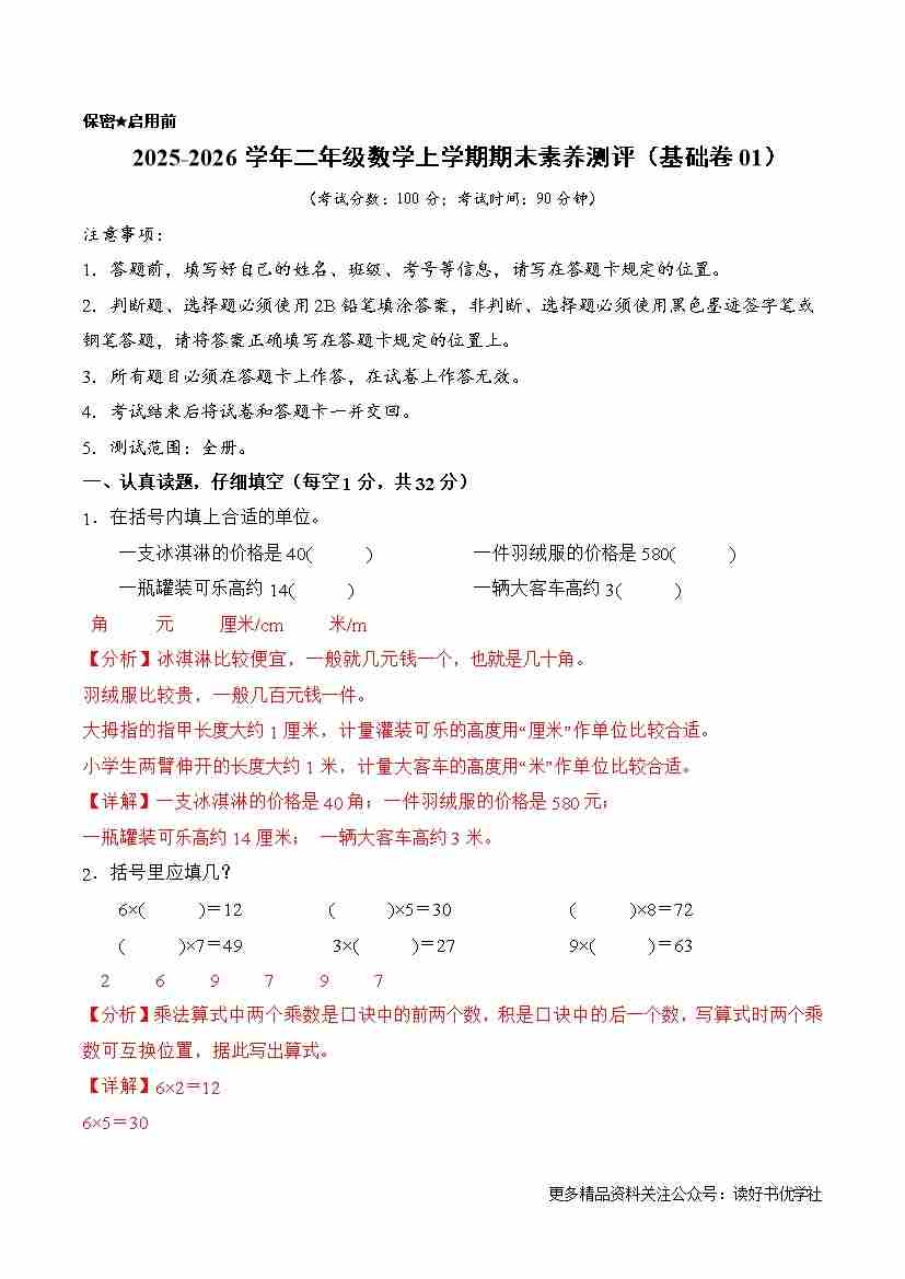 基础卷01-2025-2026学年二年级数学上学期期末素养测评(基础卷01)(北师大版)(参考解析)