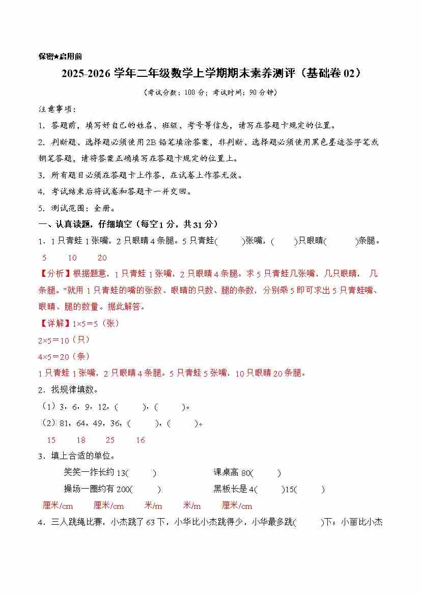 基础卷02-2025-2026学年二年级数学上学期期末素养测评(基础卷02)(北师大版)(参考解析)