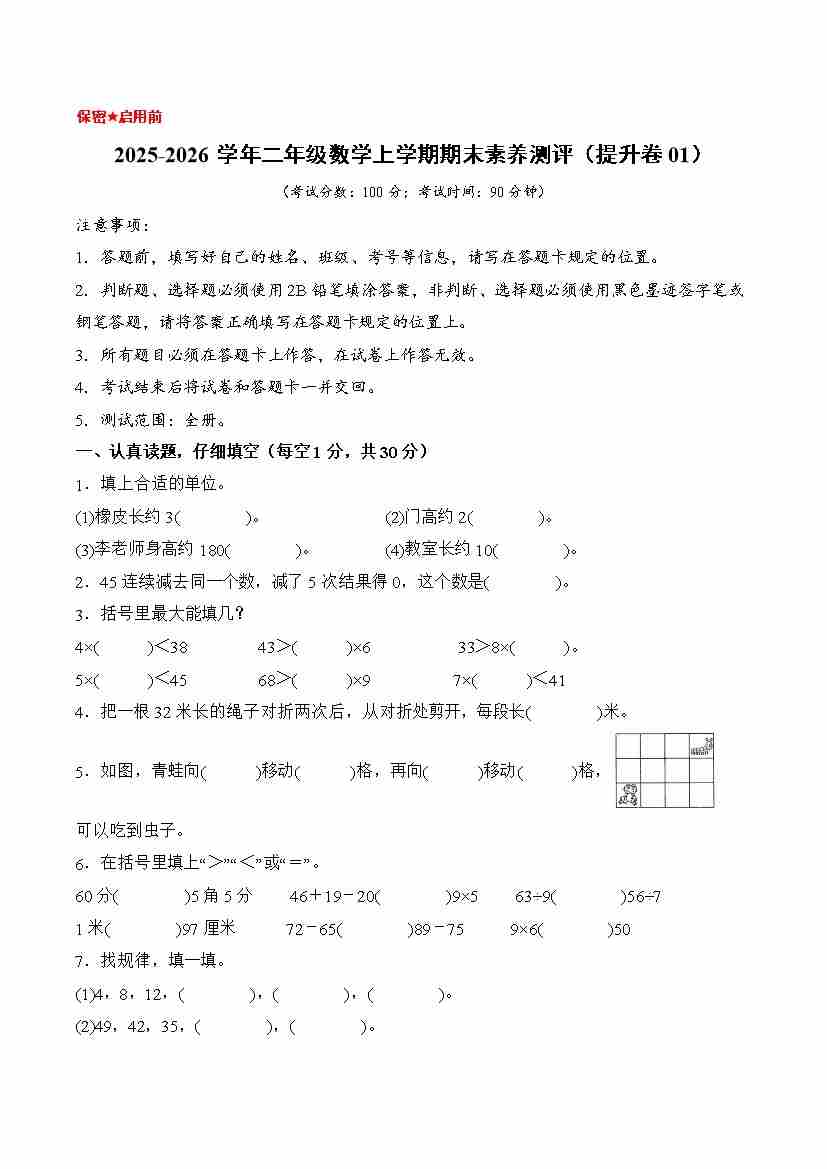 提高卷01-2025-2026学年二年级数学上学期期末素养测评(提升卷01)(北师大版)(考试版A4)