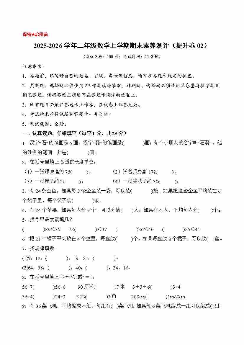 提高卷02-2025-2026学年二年级数学上学期期末素养测评(提升卷02)(北师大版)(参考解析)