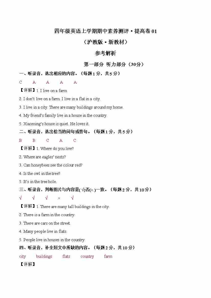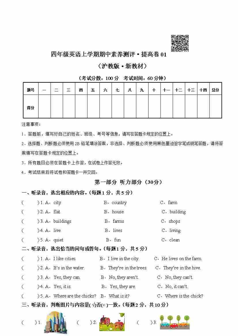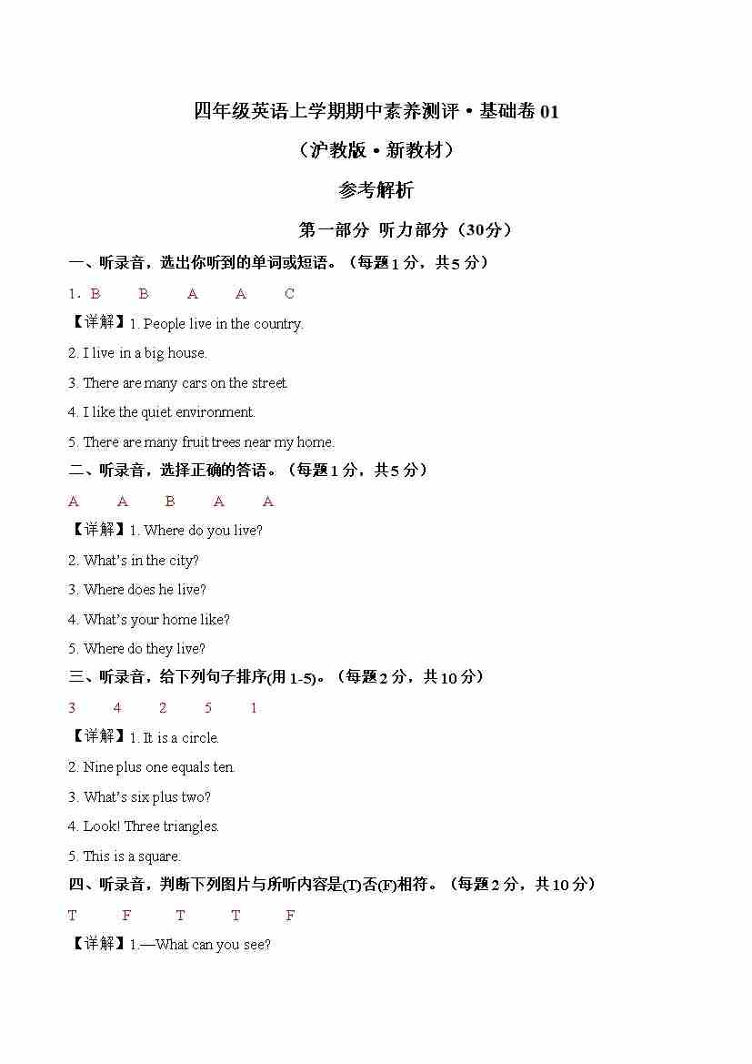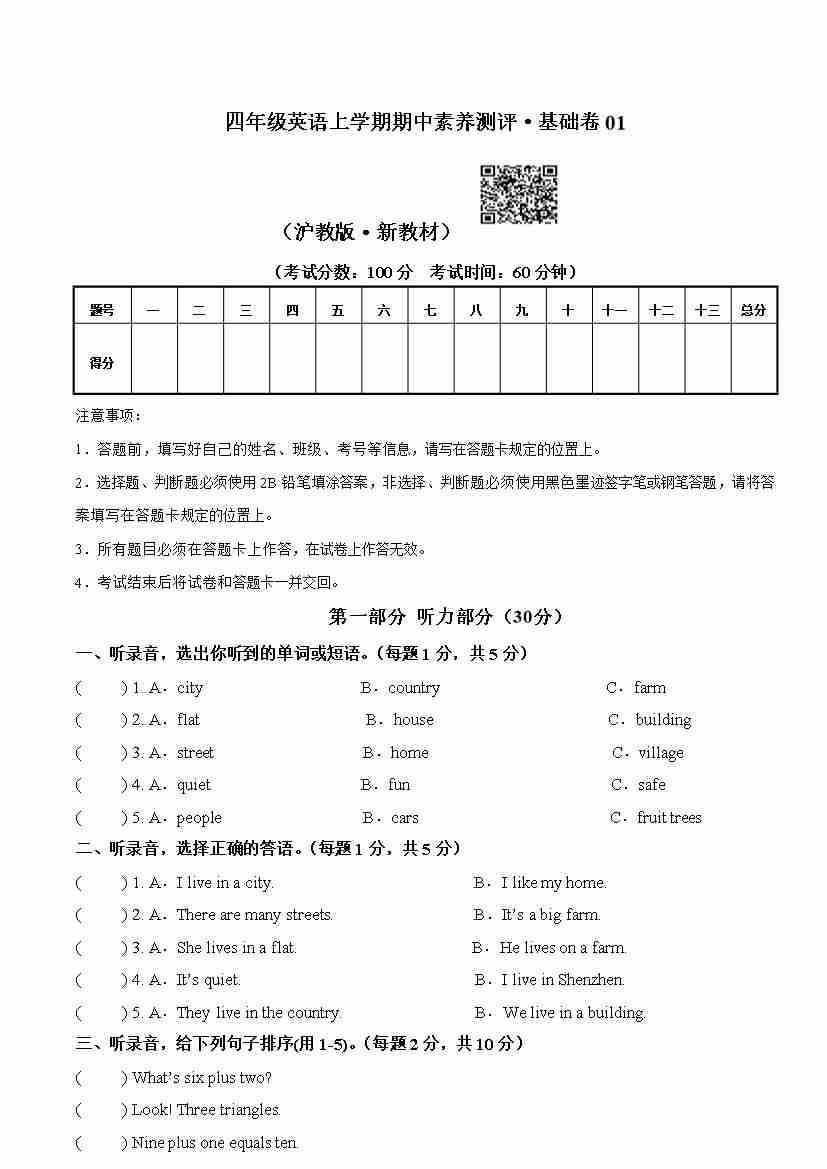 沪教版英语(三起)四年级上册(2024)期中综合素质达标(含答案,含听力原文,无听力音频)