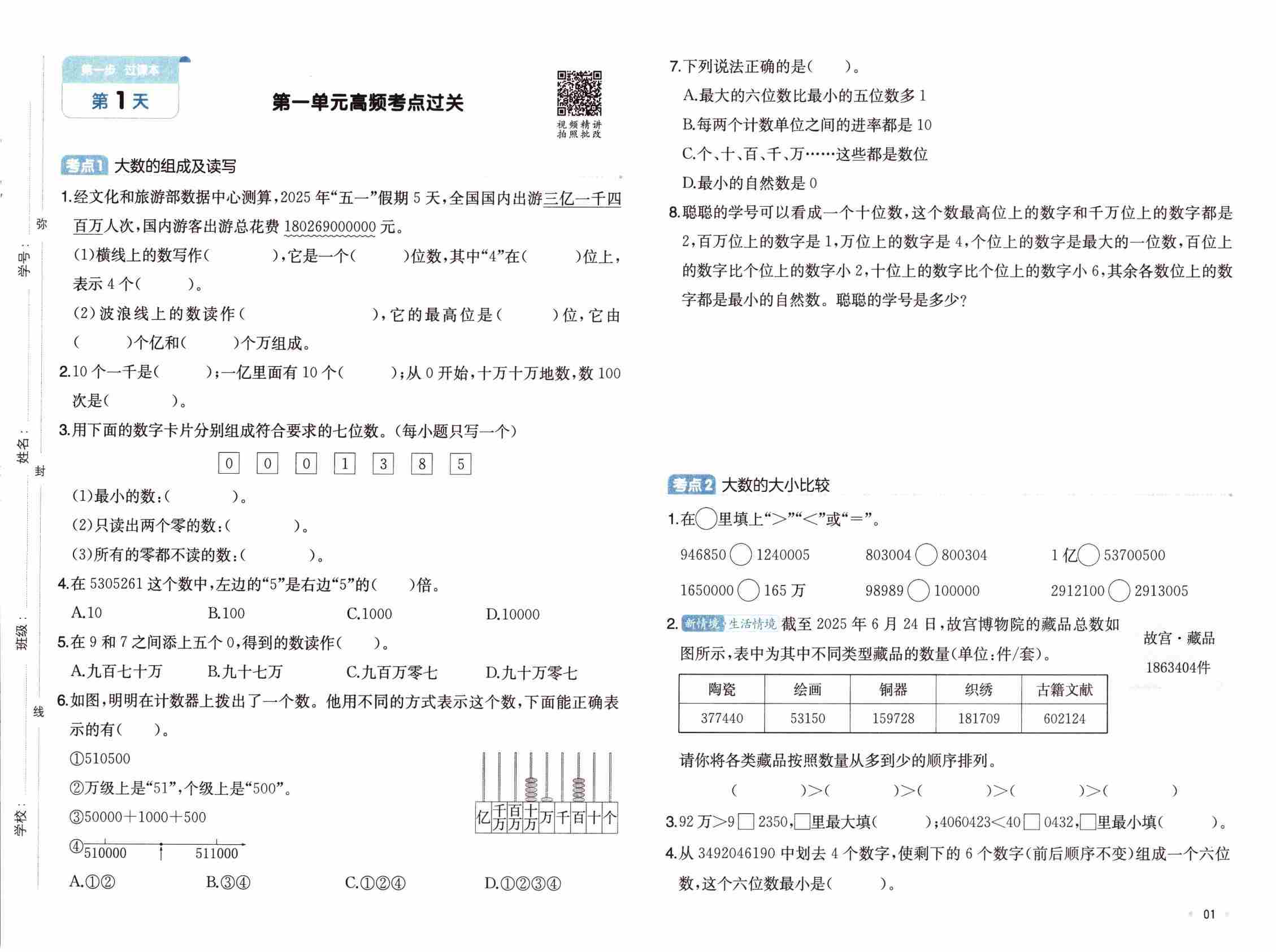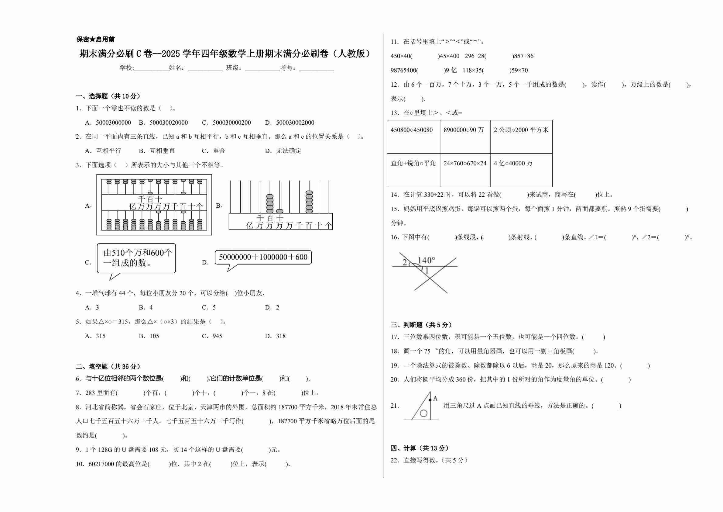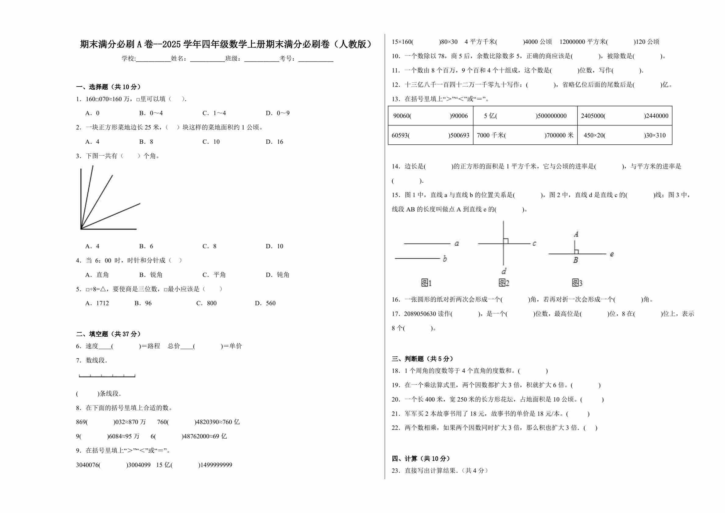 2025学年四年级数学上册人教版期末满分必刷卷1