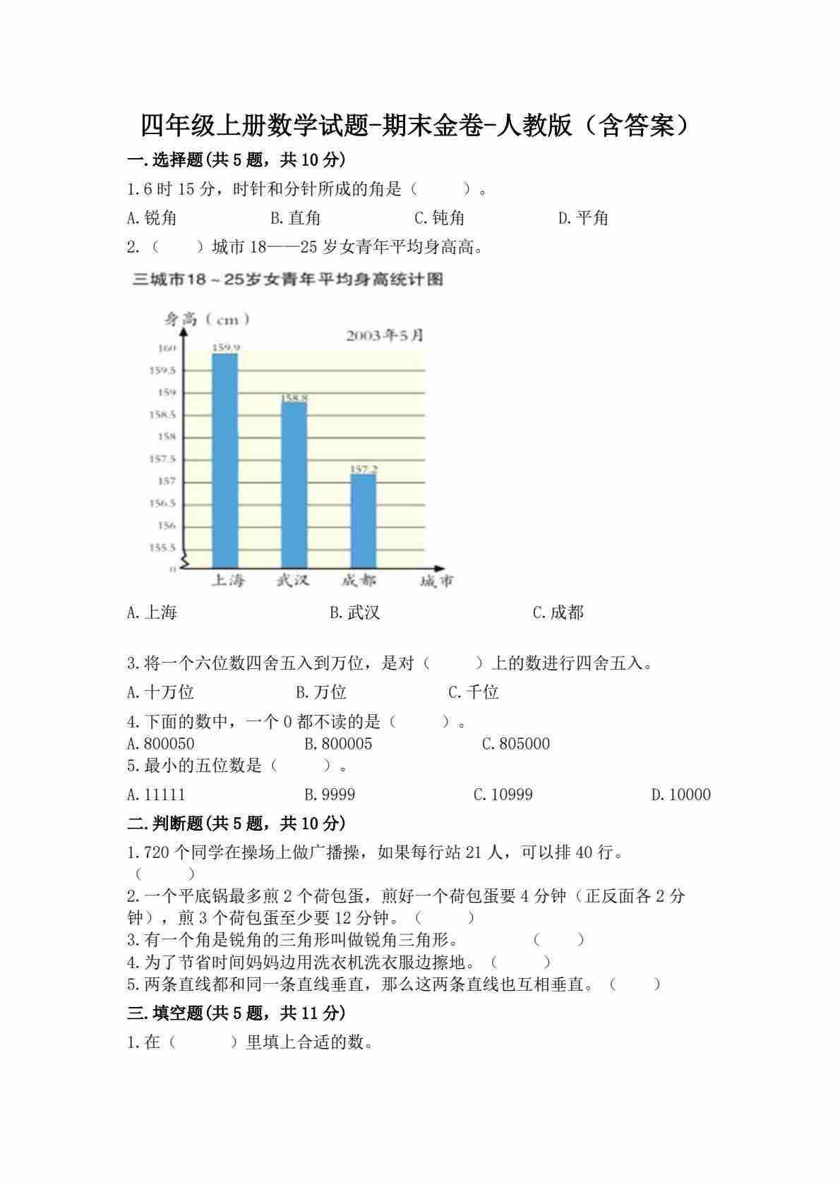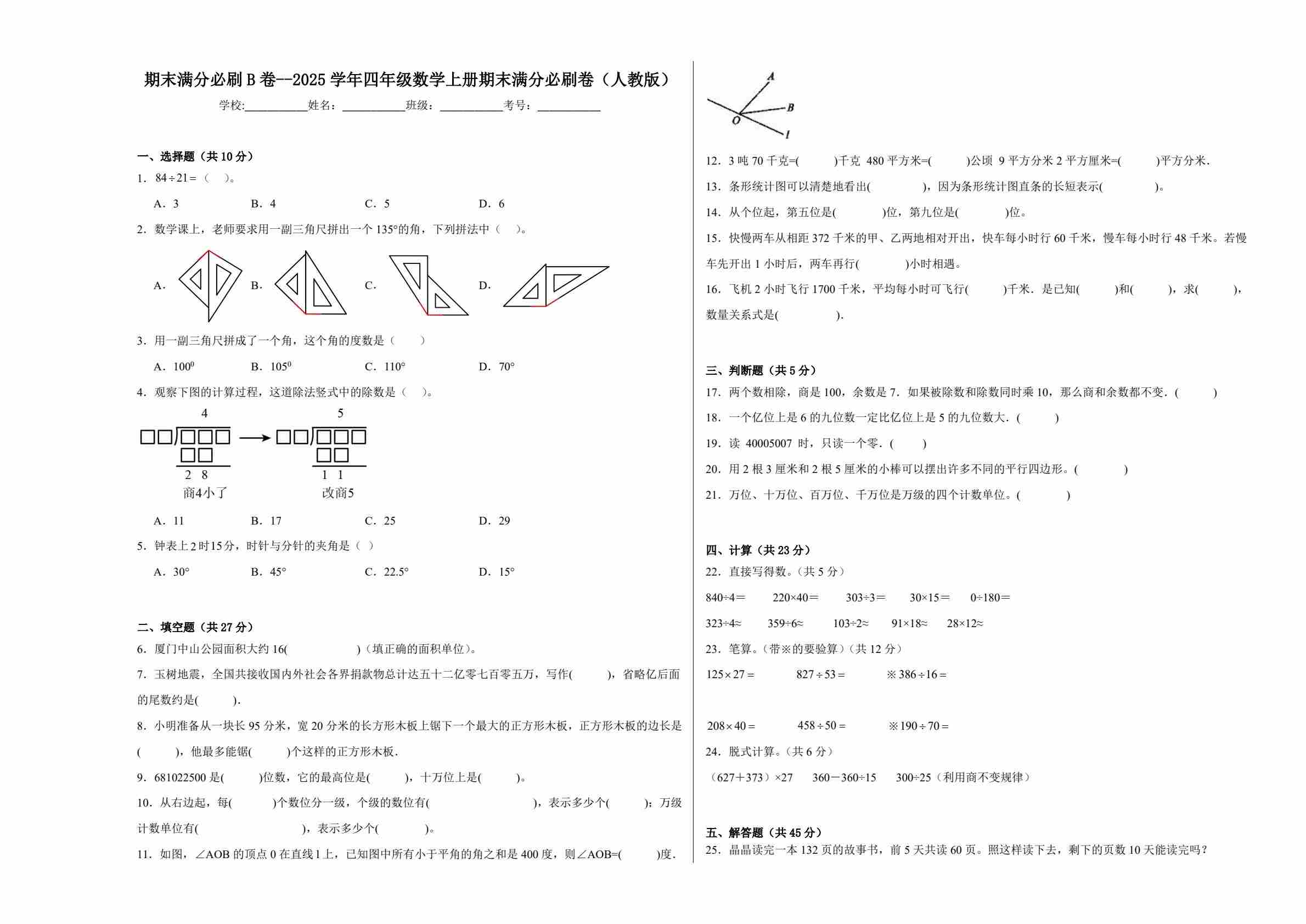 四年级(上)数学 期末押题模拟测试卷全5套《人教版》(含答案25页)