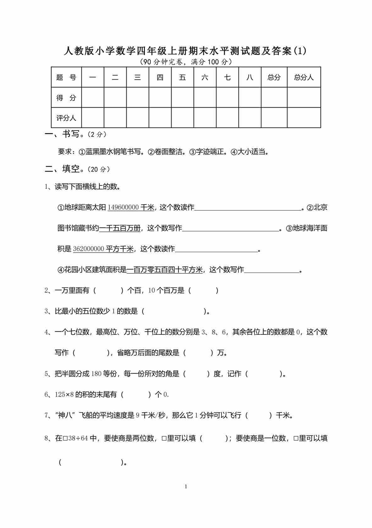 人教版小学数学四年级上册期末水平测试题及答案1