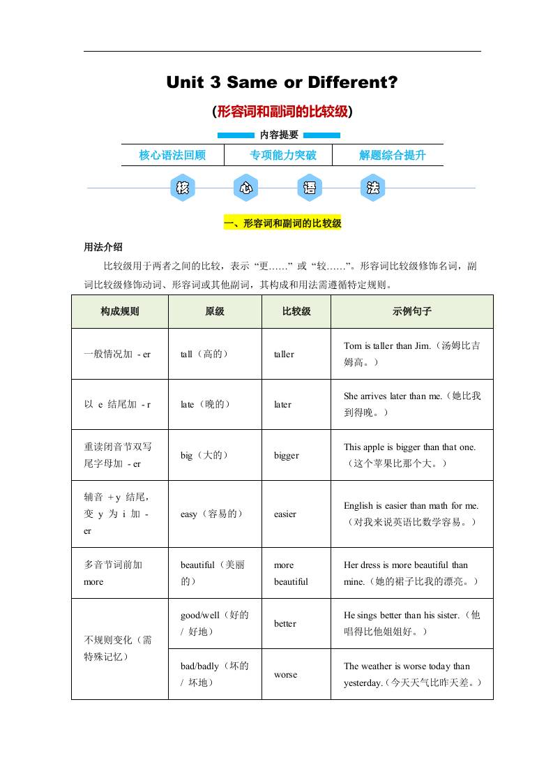 Unit 3 Same or Different 形容词和副词的比较级(原卷版)