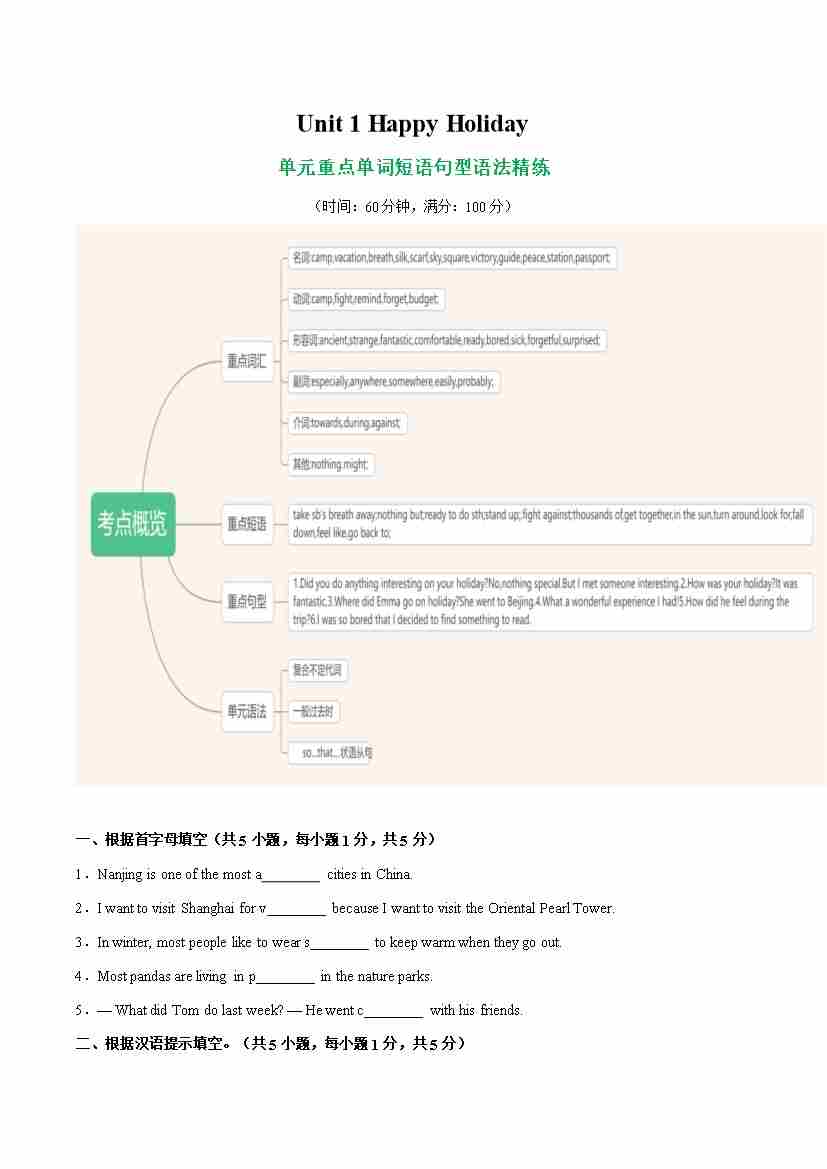 Unit 1 Happy Holiday 单词短语句型语法(教材考点精练)(原卷版)