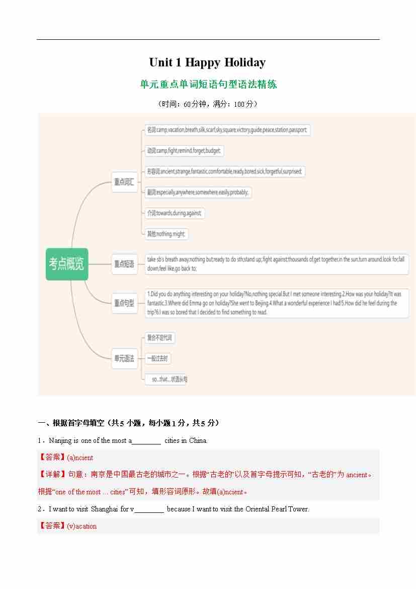 Unit 1 Happy Holiday 单词短语句型语法(教材考点精练)(解析版)