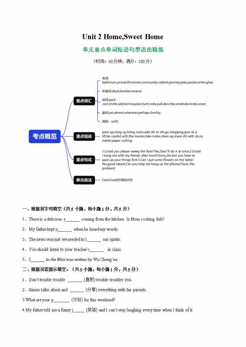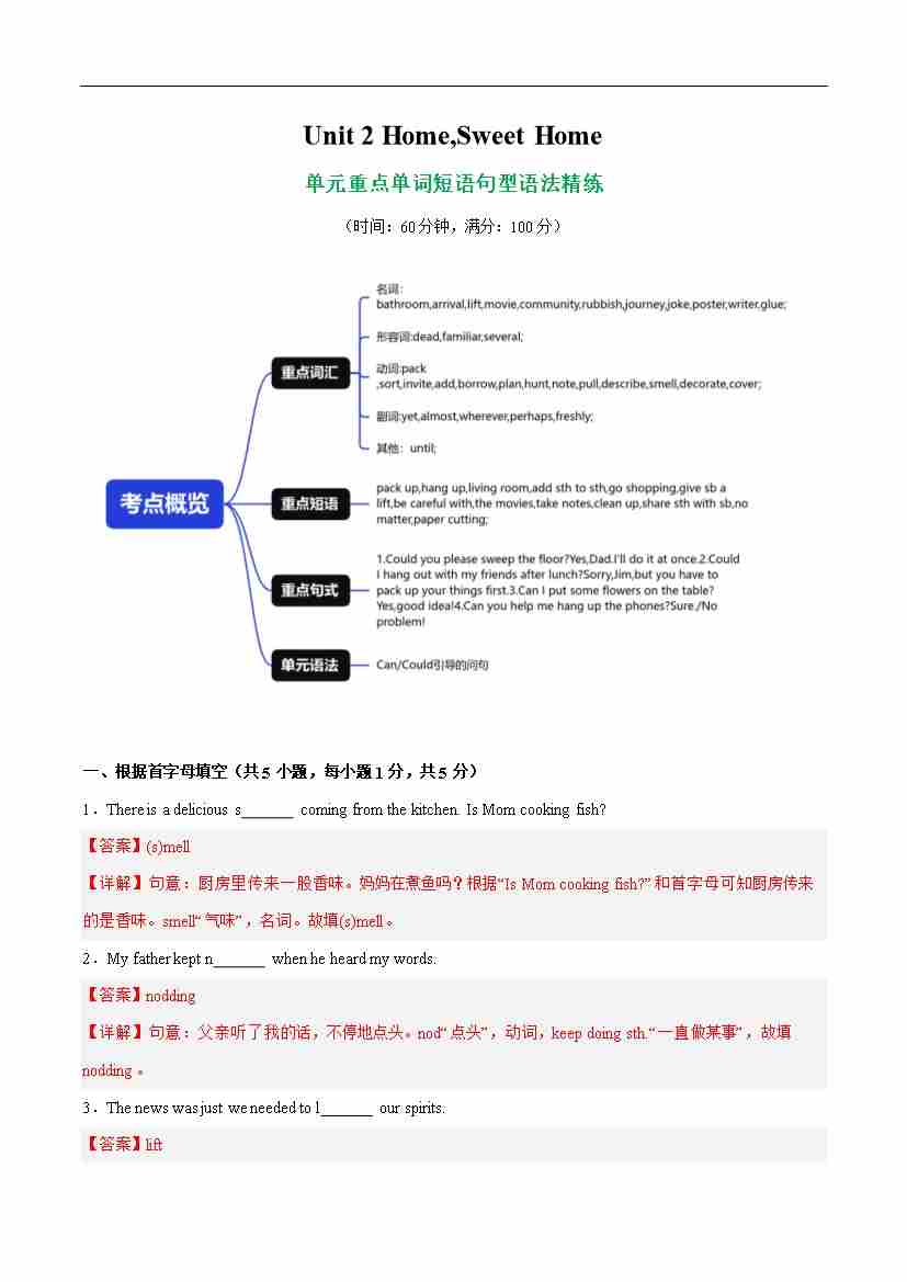 Unit 2 Home,Sweet Home 单词短语句型语法(教材考点精练)(解析版)