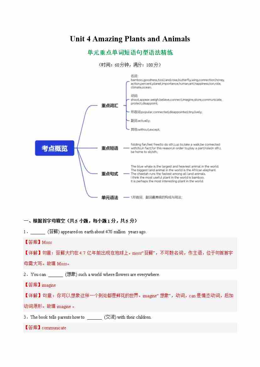 Unit 4 Amazing Plants and Animals 单词短语句型语法(教材考点精练)(解析版)
