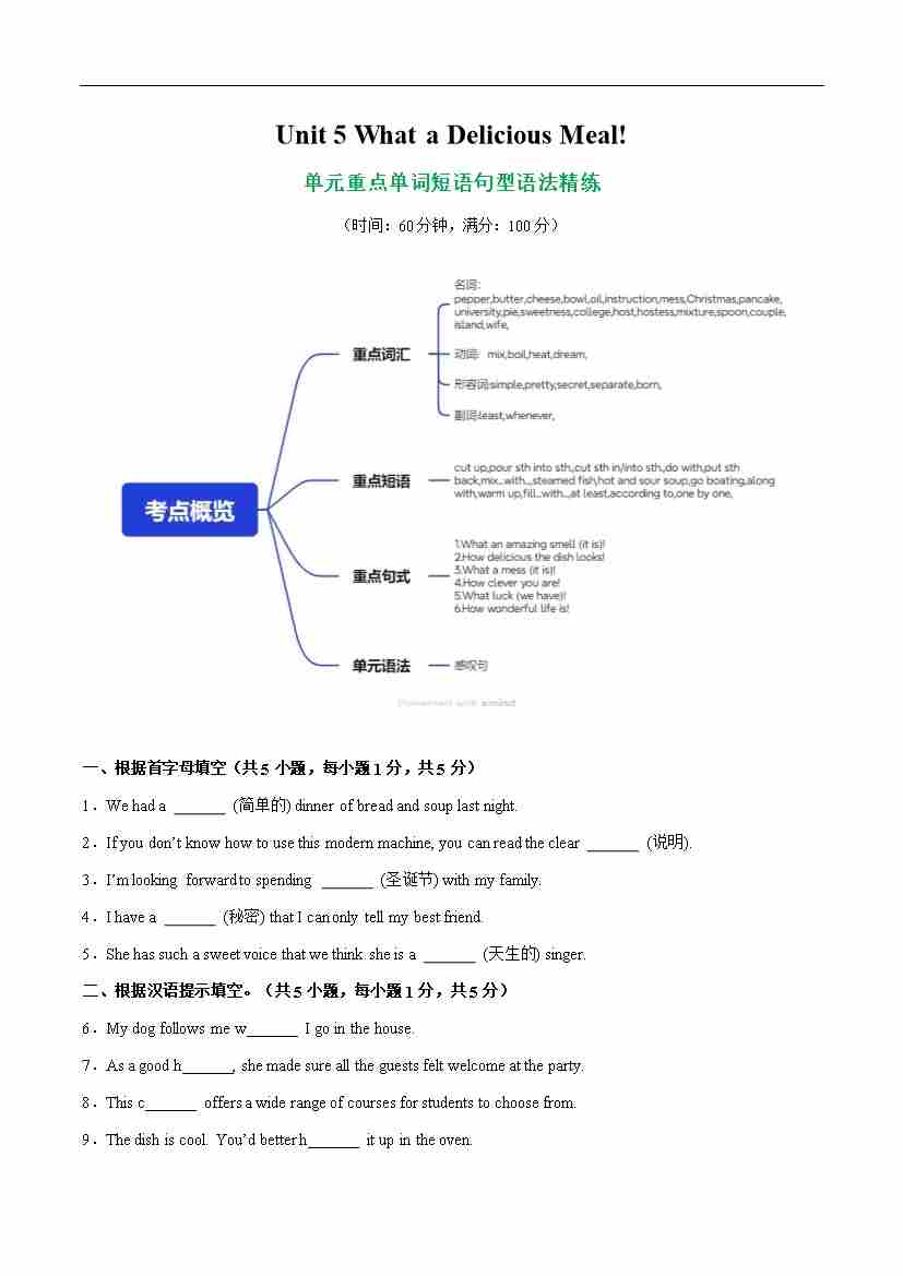 Unit 5 What a Delicious Meal! 单词短语句型语法(教材考点精练)解析版