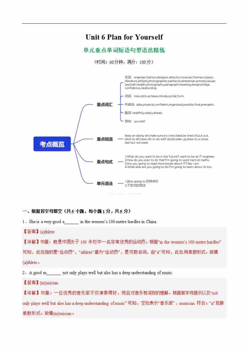 Unit 6 Plan for Yourself 单词短语句型语法(教材考点精练)(解析版)