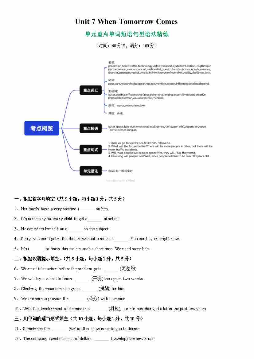 Unit 7 When Tomorrow Comes 单词短语句型语法 (教材考点精练) (原卷版)