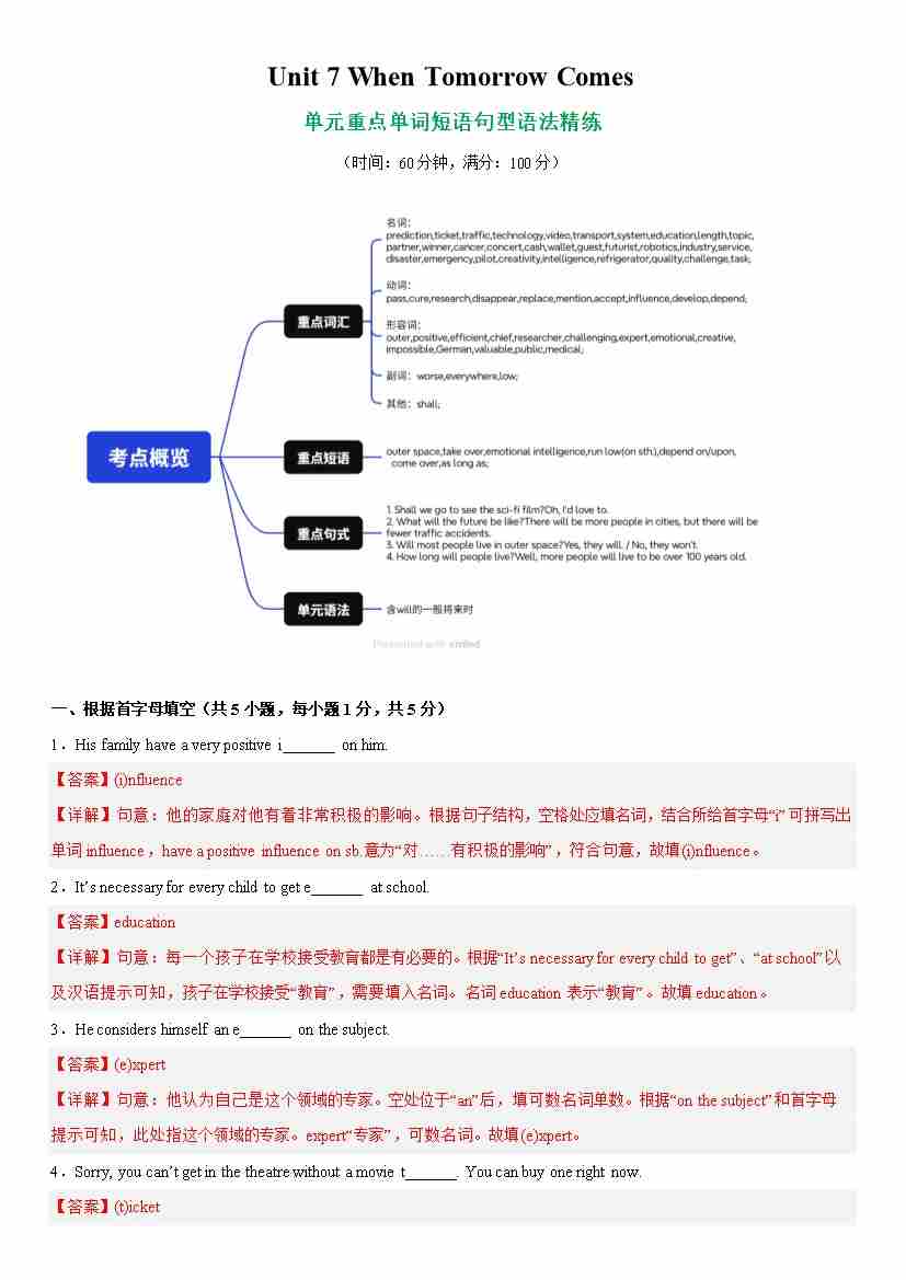 Unit 7 When Tomorrow Comes 单词短语句型语法 (教材考点精练) (解析版)