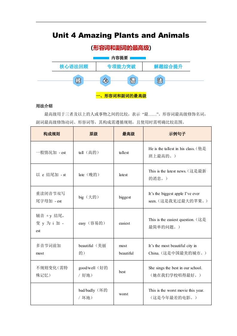 Unit 4 Amazing Plants and Animals 形容词和副词的最高级(解析版)