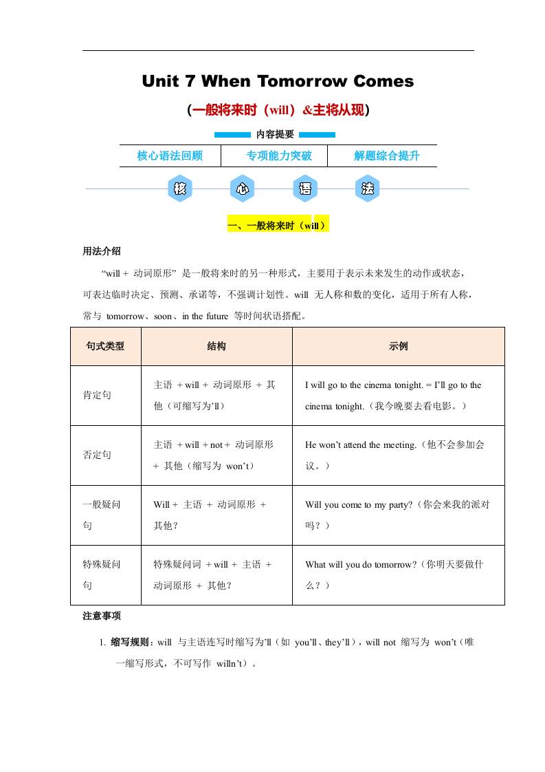 Unit 7 When Tomorrow Comes 一般将来时(will)&主将从现(解析版)