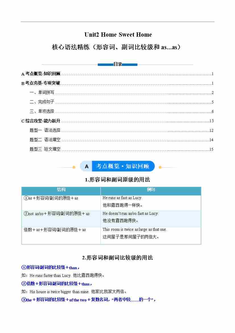 Unit 3 Same or Different?形容词、副词比较级和as...as(单元核心语法精练)(原卷版)