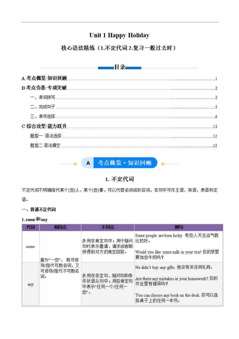 Unit 1 Happy Holiday 不定代词和复习一般过去时(单元核心语法精练)(解析版)