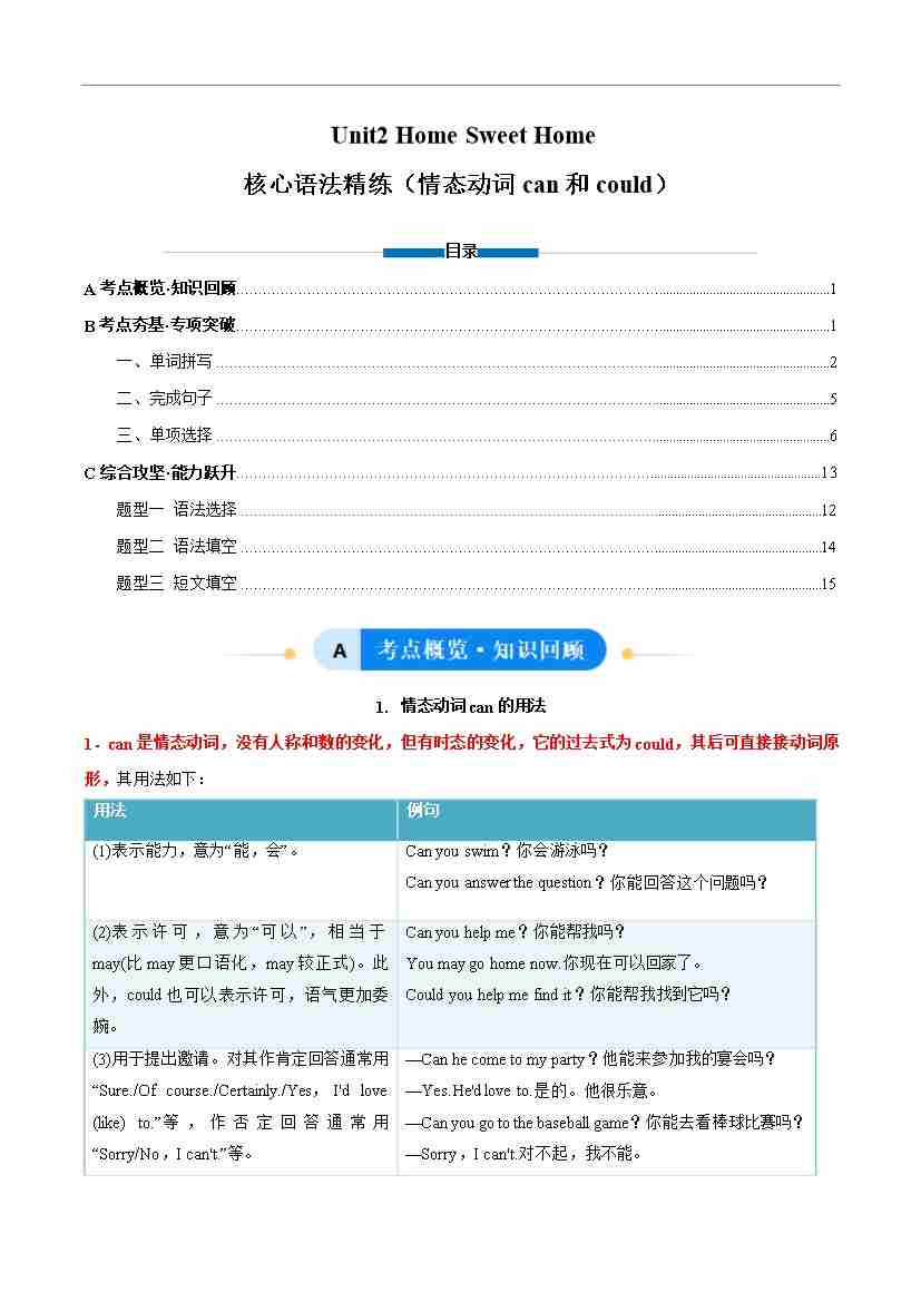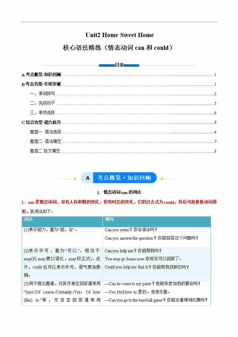 Unit 2 Home Sweet Home 情态动词can和could(单元核心语法精练)(原卷版)