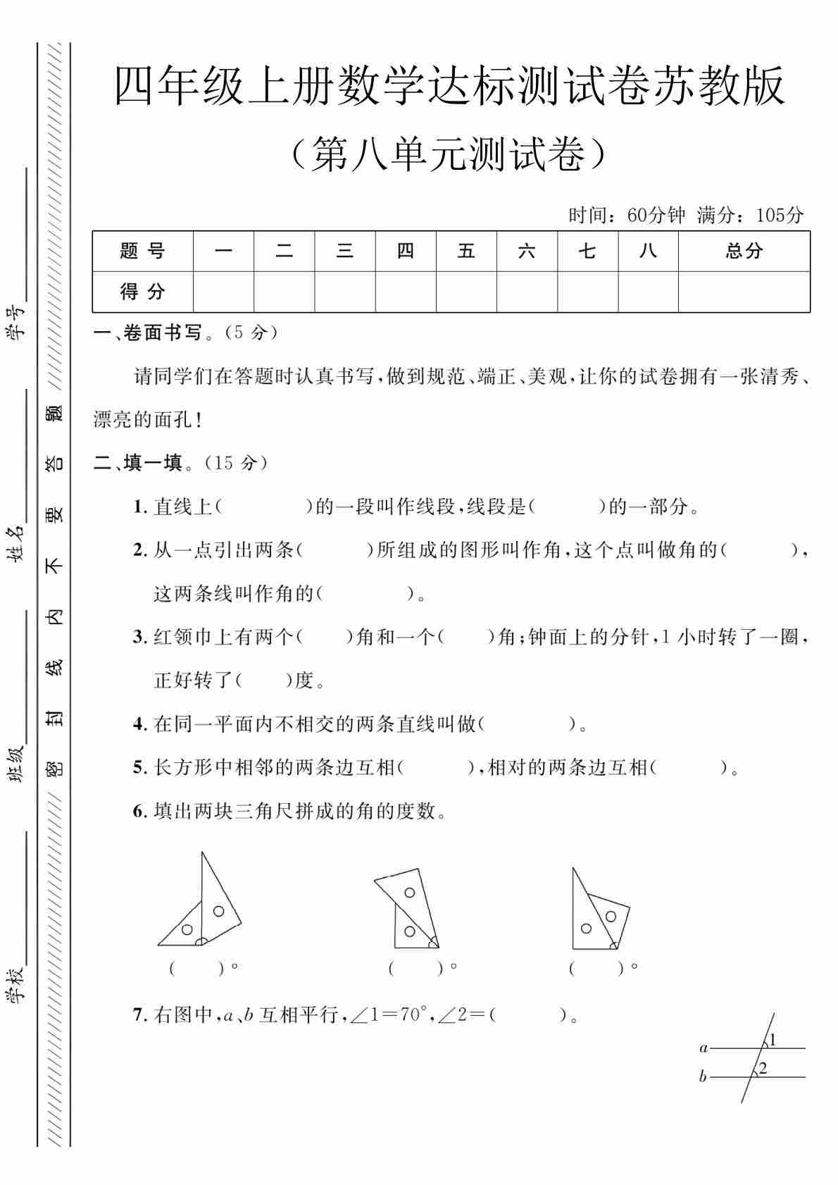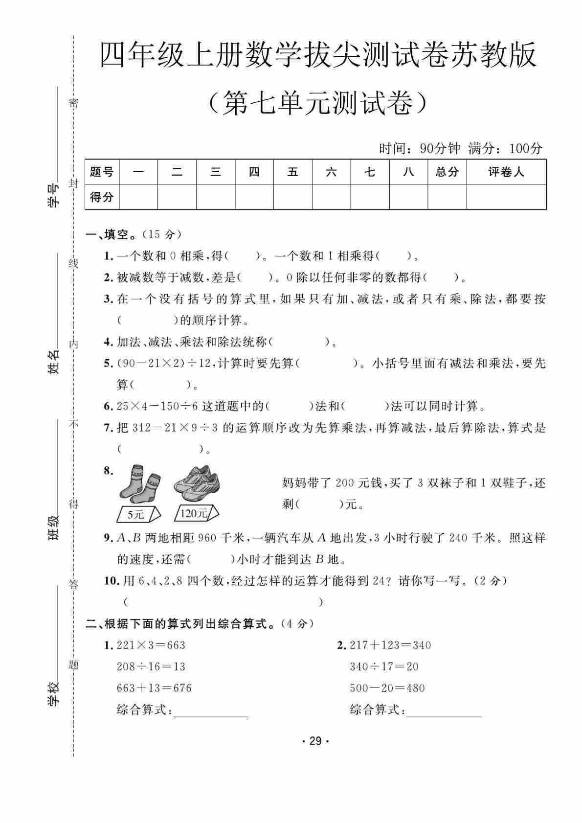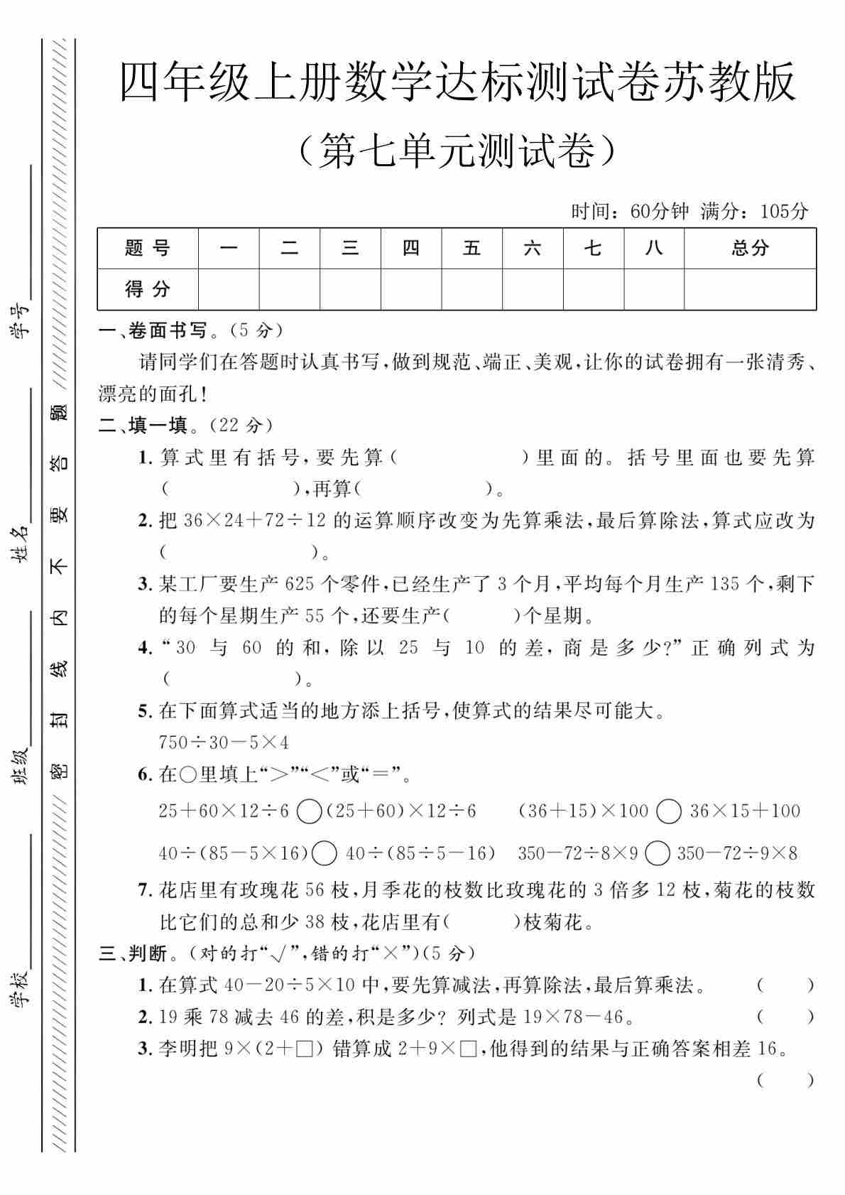 四上苏教版数学【第七单元测试卷1】