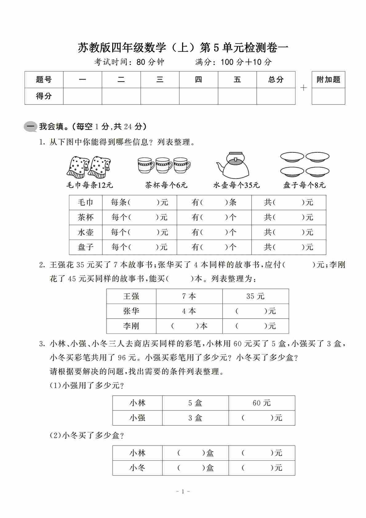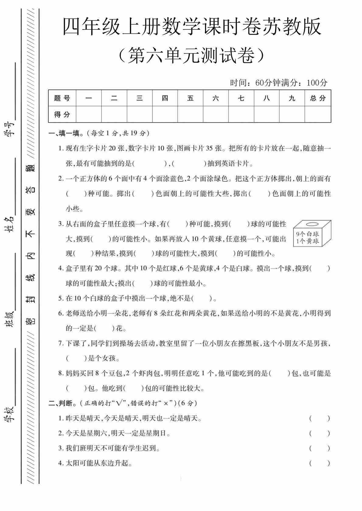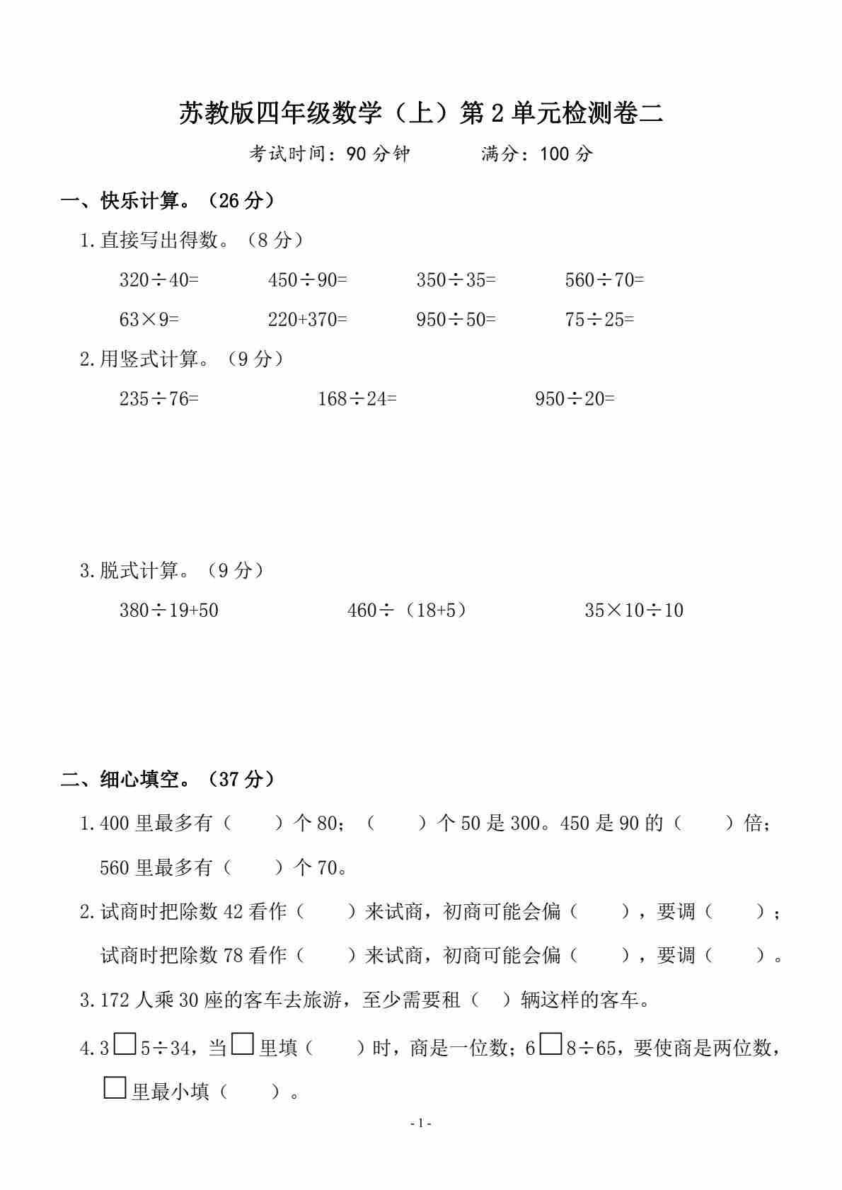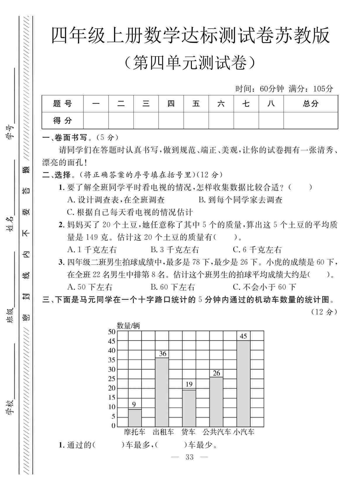 四上苏教版数学【第七单元测试卷1】