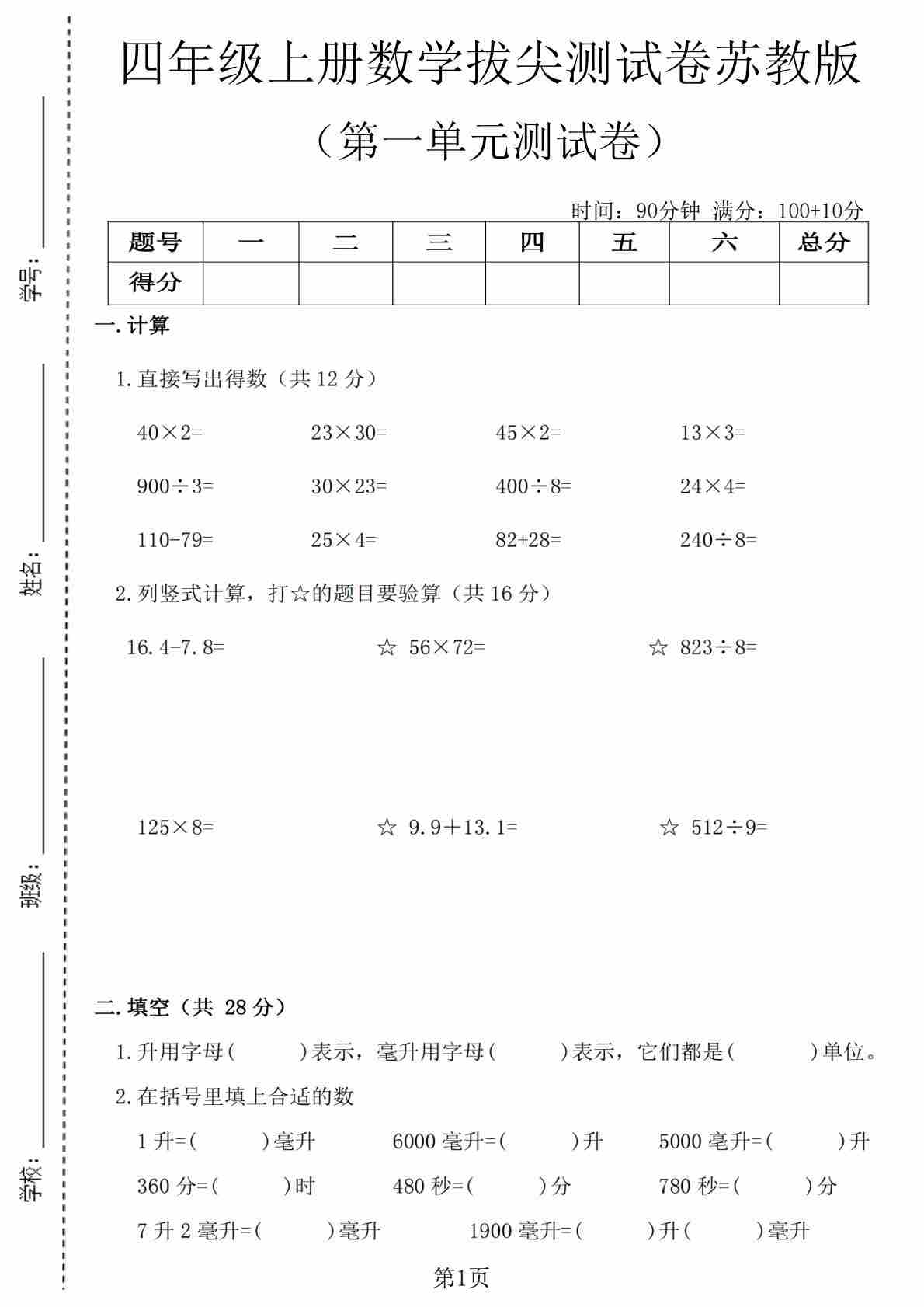 四上苏教版数学【第六单元测试卷1】