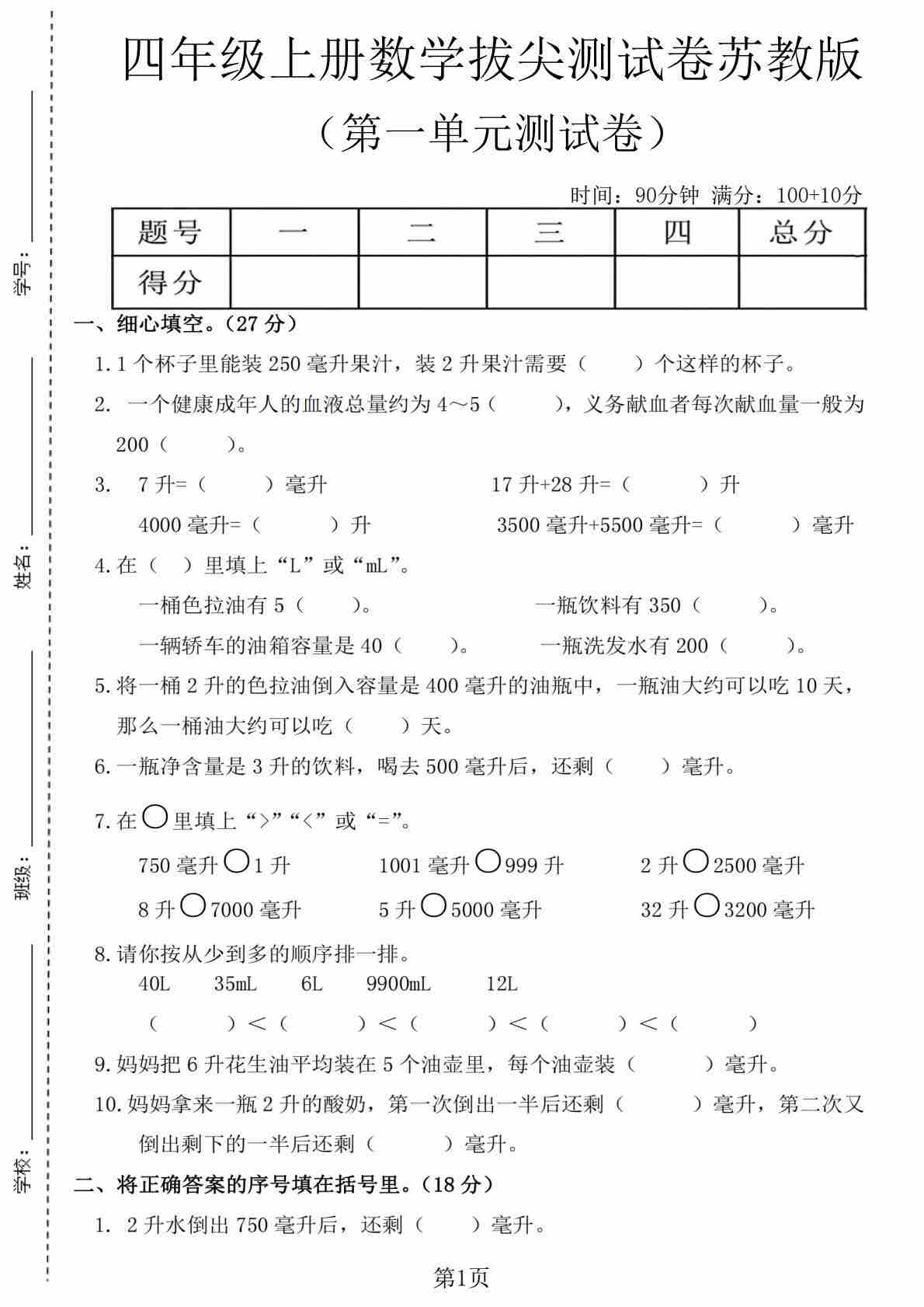 四年级(上)苏教版数学第一单元测试卷1