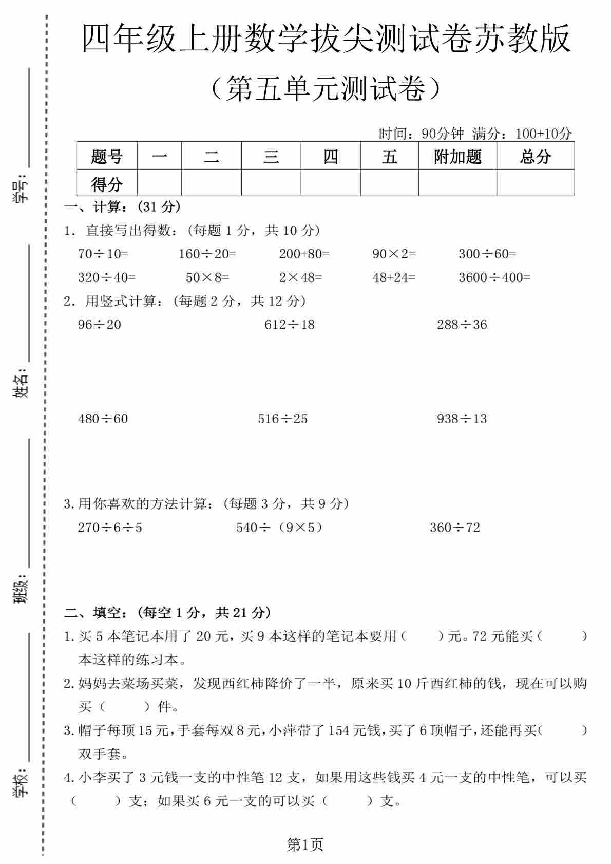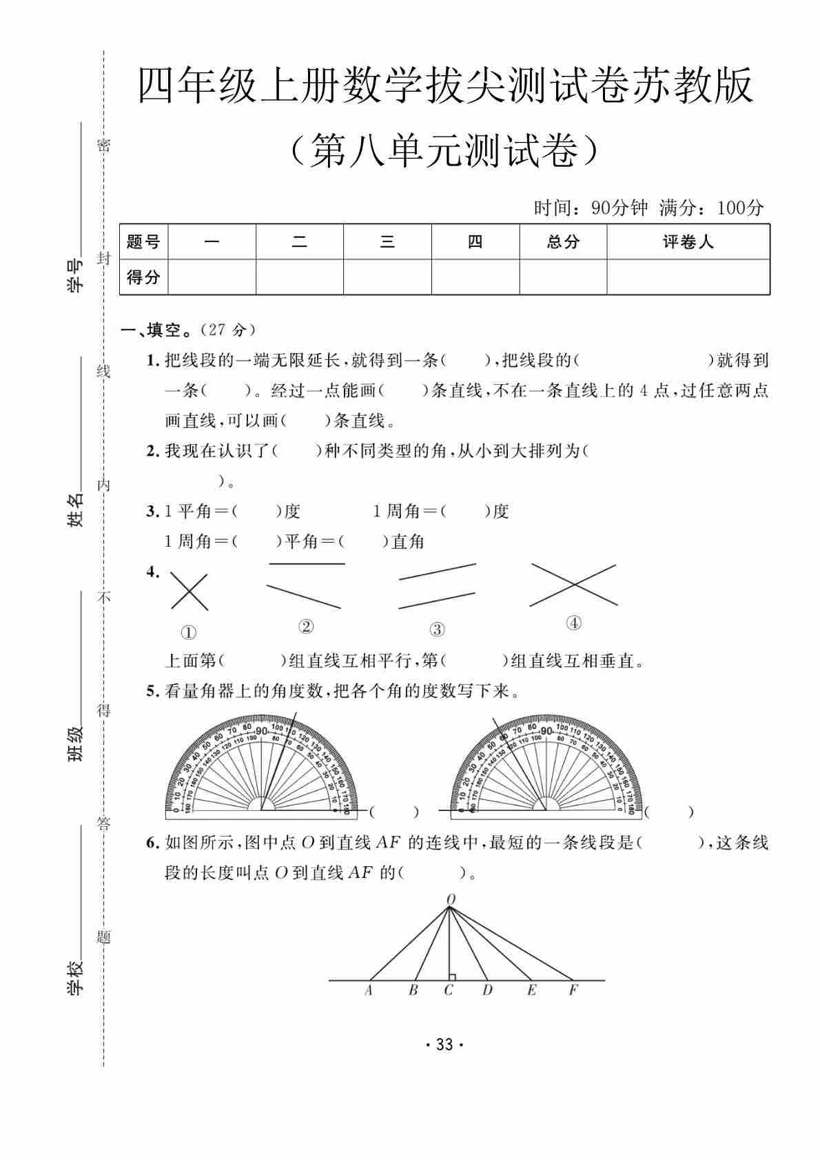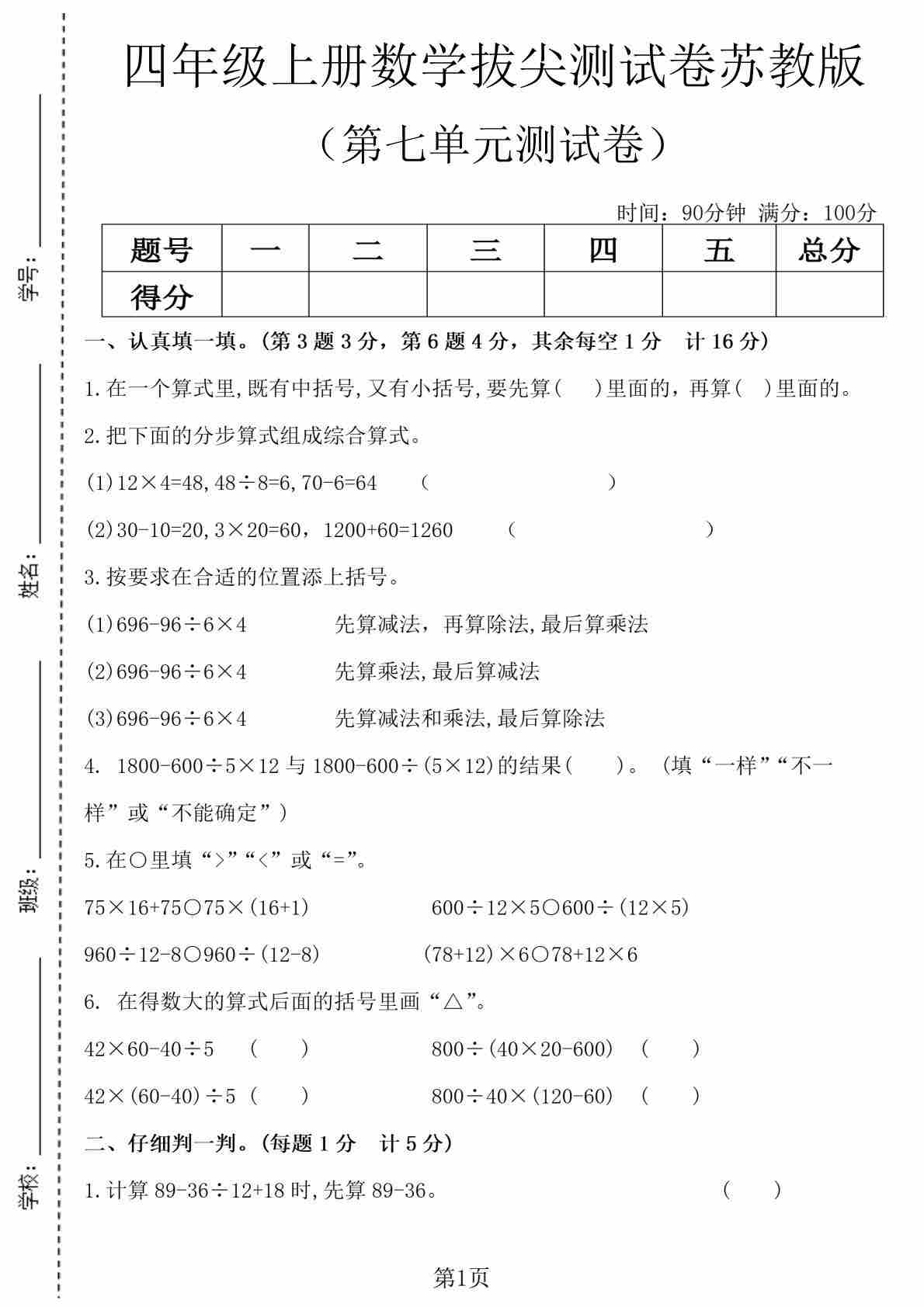 四上苏教版数学【第七单元拔尖测试卷1】