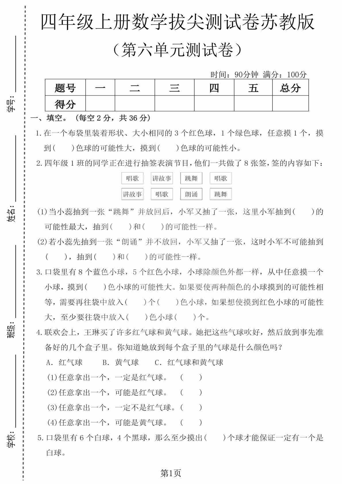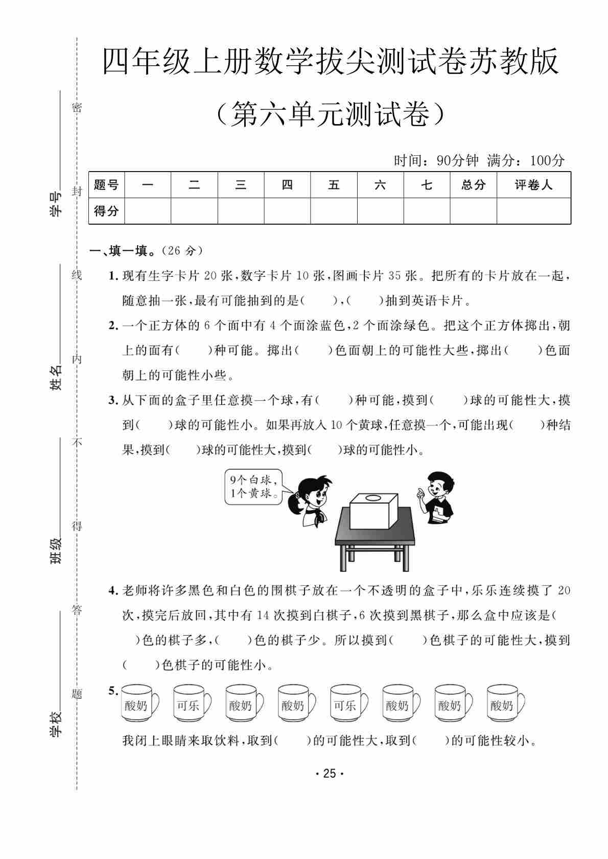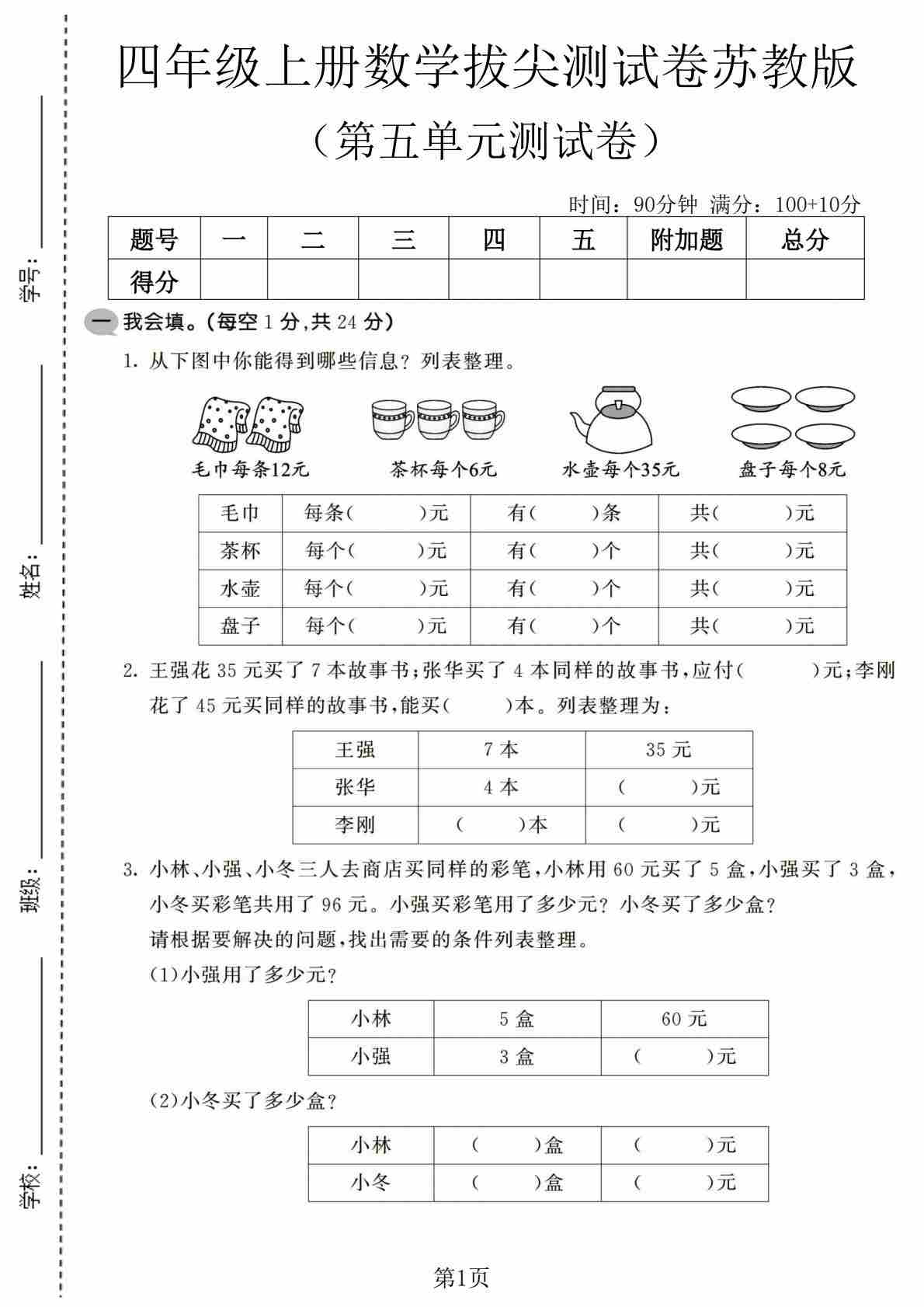 四上苏教版数学【第七单元拔尖测试卷1】