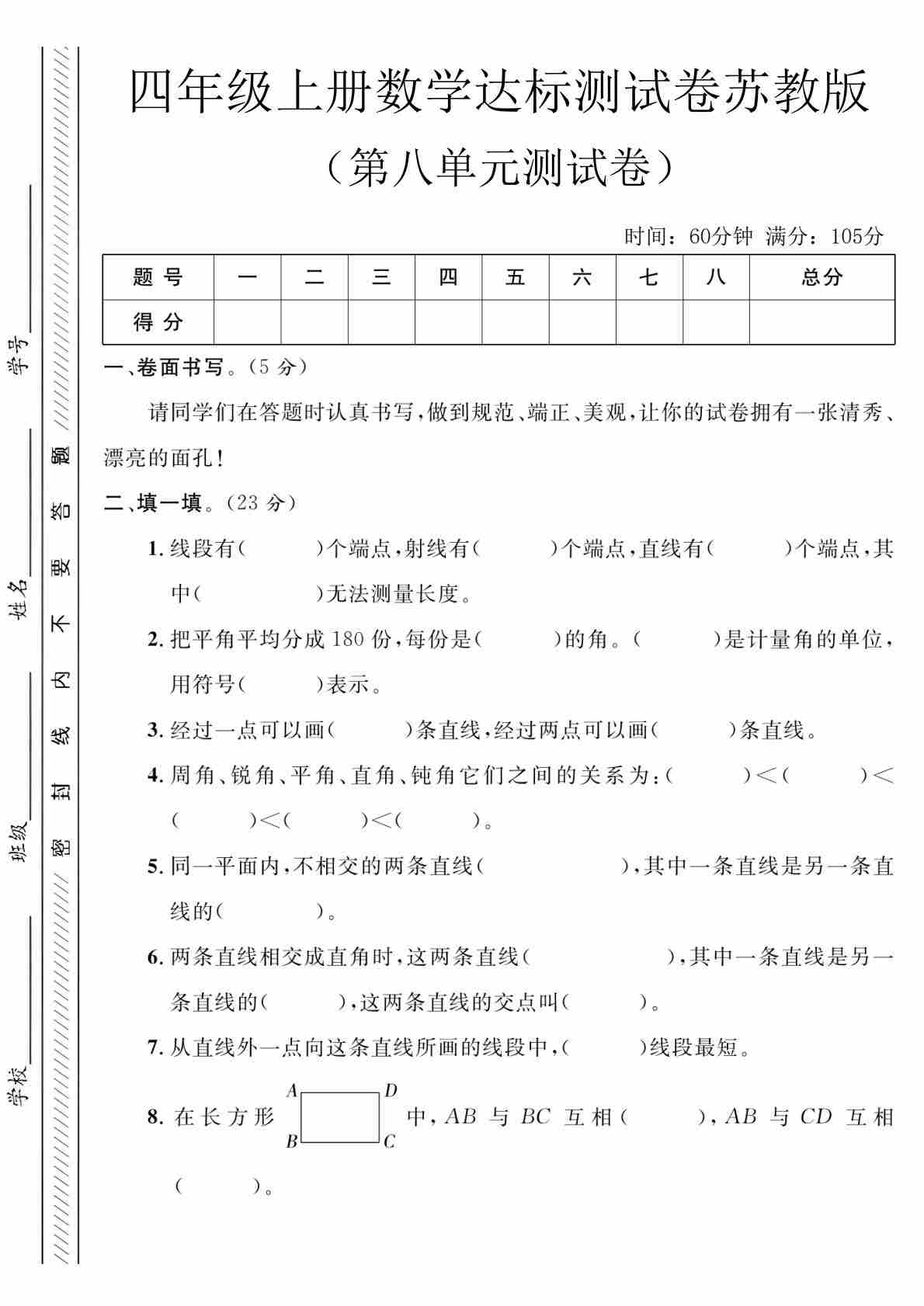 四上苏教版数学【第八单元测试卷1】