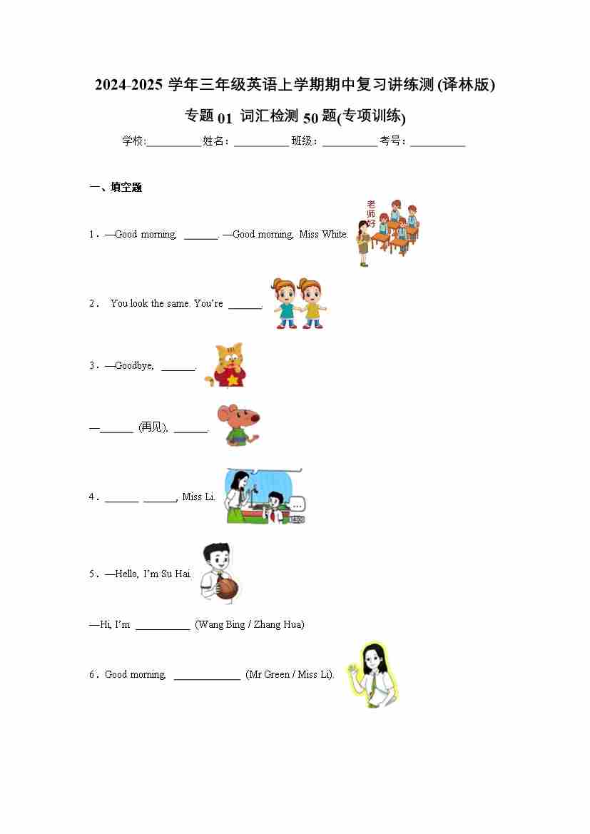 专题01 (词汇专项训练)-2024-2025学年三年级英语上学期期中复习讲练测(译林版