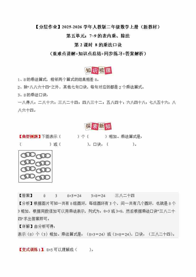 第五单元 第2课时 8的乘法口诀 (分层作业) (解析版)