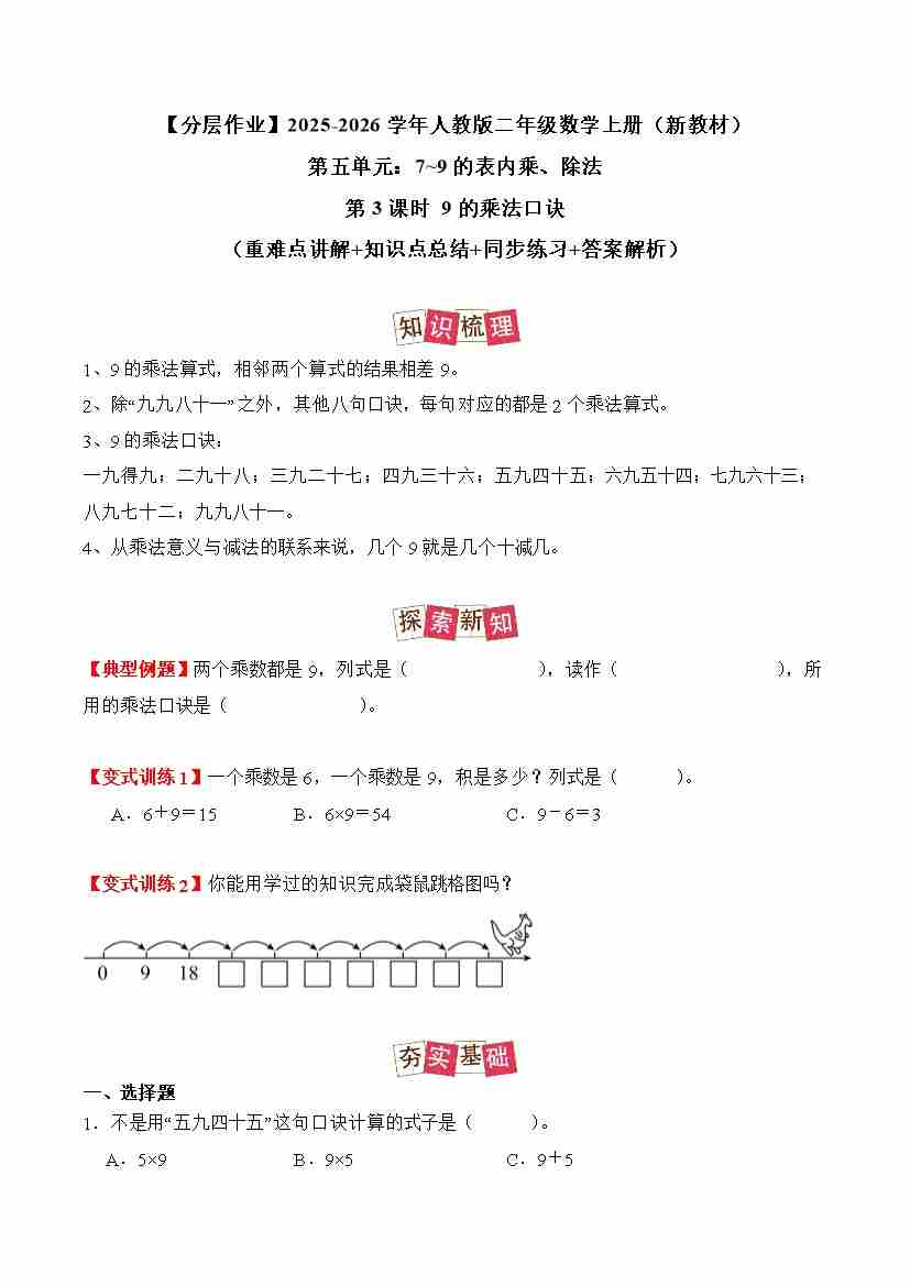第五单元 第3课时 9的乘法口诀 (分层作业) (学生版)