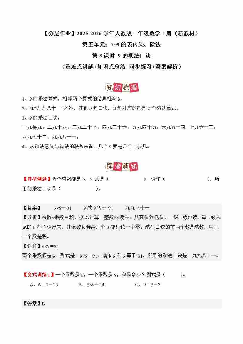 第五单元 第3课时 9的乘法口诀 (分层作业) (解析版)