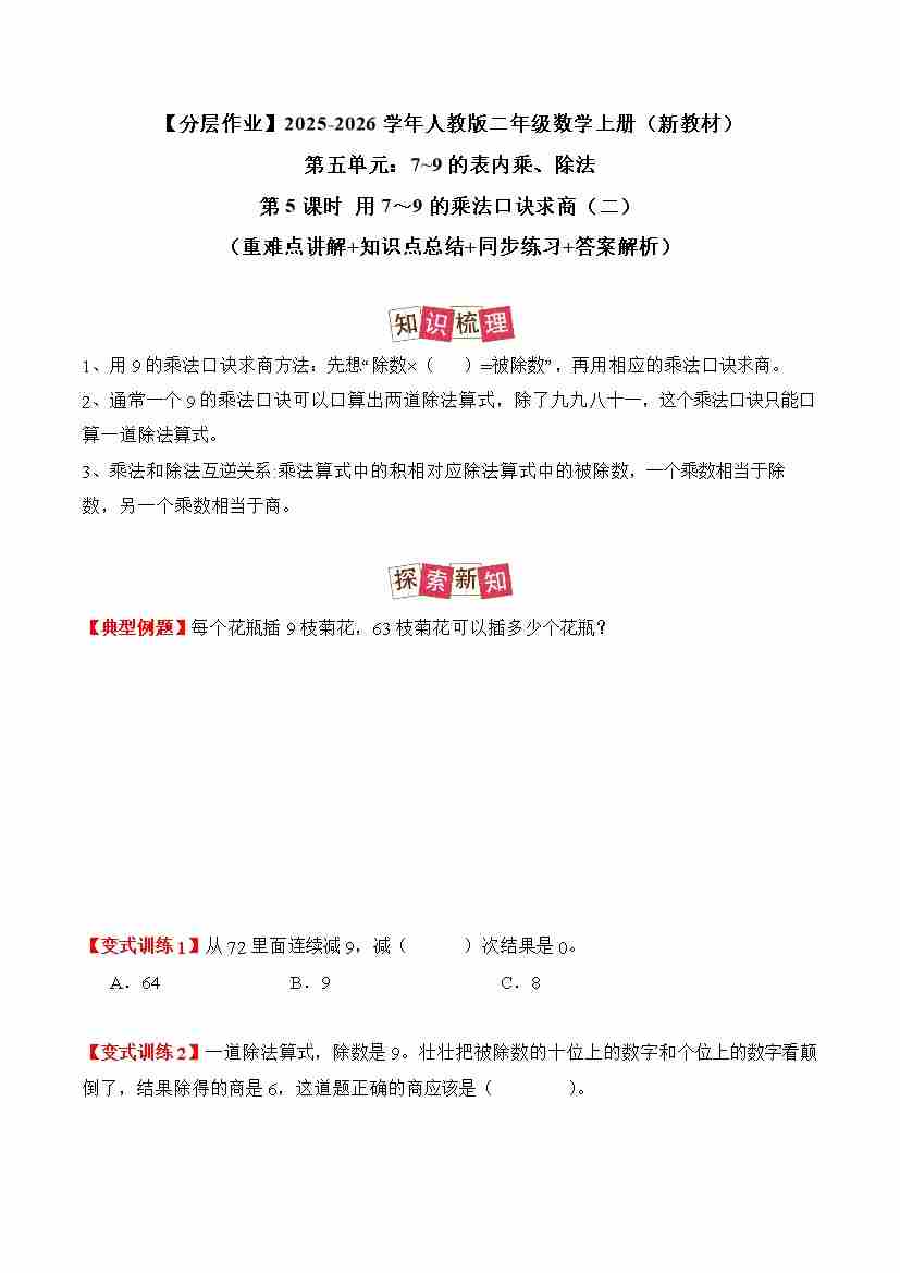第五单元 第5课时 用7~9的乘法口诀求商(二)(分层作业) (学生版)