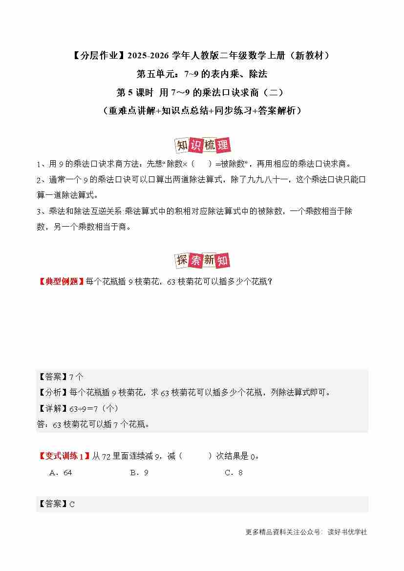 第五单元 第5课时 用7~9的乘法口诀求商(二)(分层作业) (解析版)