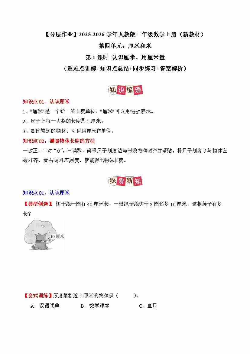 第四单元 第1课时 认识厘米、用厘米量 (分层作业)(学生版)